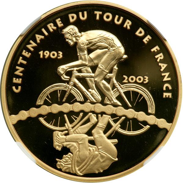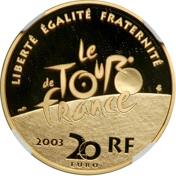 France. 20 Euro, 2003. Weight 0.5028 ounce. Tour De France. Cyclist Going Left. NGC graded Proof 70 Ultra Cameo.