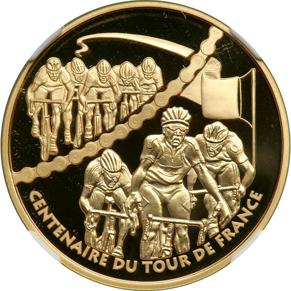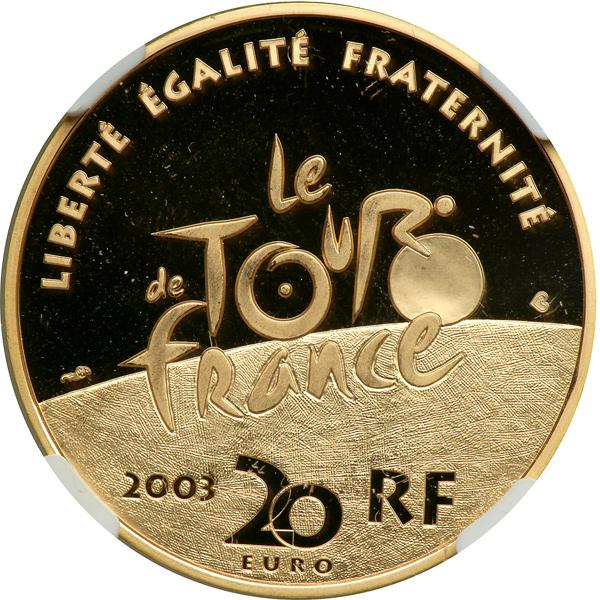 France. 20 Euro, 2003. Weight 0.5028 ounce. Tour De France. Cyclist with Flag. NGC graded Proof 70 Ultra Cameo.