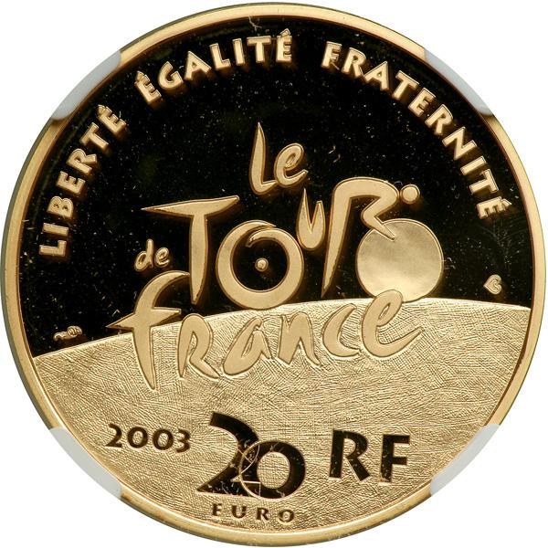 France. 20 Euro, 2003. Weight 0.5028 ounce. Tour De France. Cyclist with Flag. NGC graded Proof 70 Ultra Cameo.