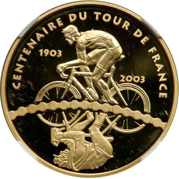 France. 20 Euro, 2003. Weight 0.5028 ounce. Tour De France. Cyclist Going Left. NGC graded Proof 70 Ultra Cameo.