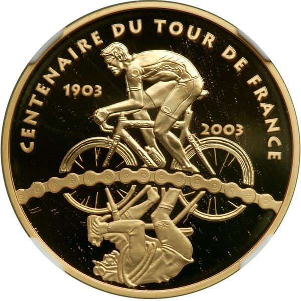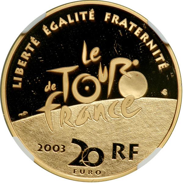 France. 20 Euro, 2003. Weight 0.5028 ounce. Tour De France. Cyclist Going Left. NGC graded Proof 70 Ultra Cameo.