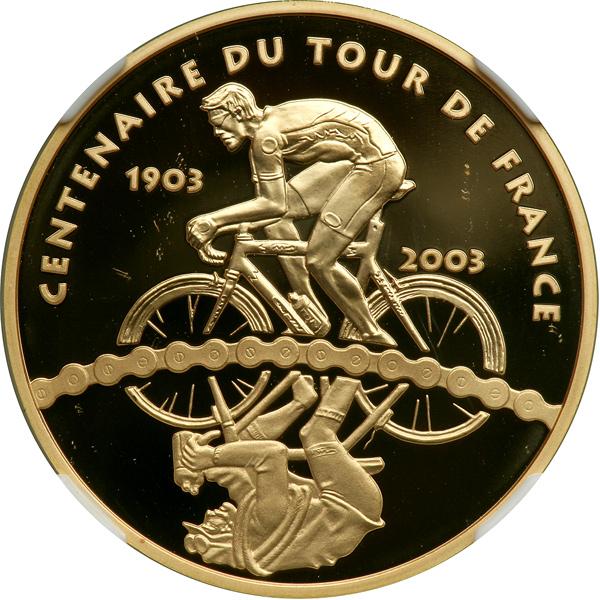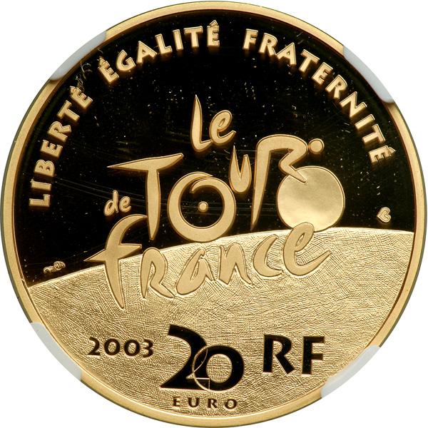 France. 20 Euro, 2003. Weight 0.5028 ounce. Tour De France. Cyclist Going Left. NGC graded Proof 70 Ultra Cameo.