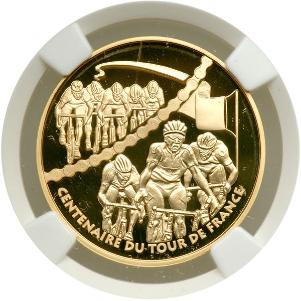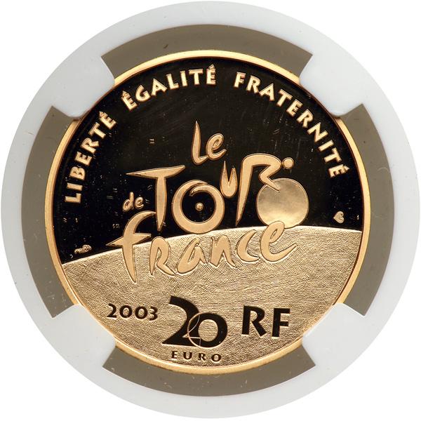 France. 20 Euro, 2003. Weight 0.5028 ounce. Tour De France. Cyclist with Flag. NGC graded Proof 69 Ultra Cameo.