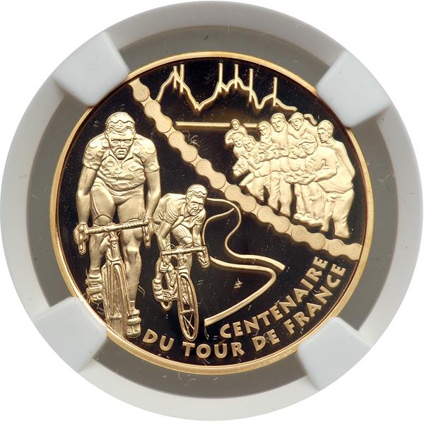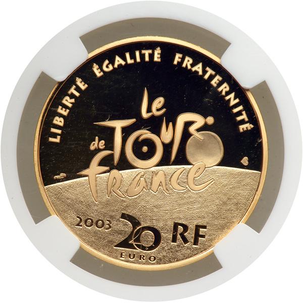 France. 20 Euro, 2003. Weight 0.5028 ounce. Tour De France. Cyclist Finish Line. NGC graded Proof 69 Ultra Cameo.