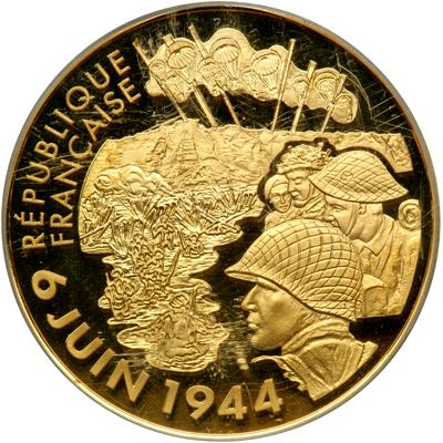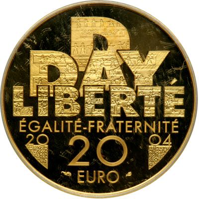 France. 20 Euro, 2004. KM-1370. Weight 0.5028. Soldiers and Normandy invasion scene. Reverse: D-Day above. Mintage 2,000 pieces. PCGS graded Proof 69 Deep Cameo.