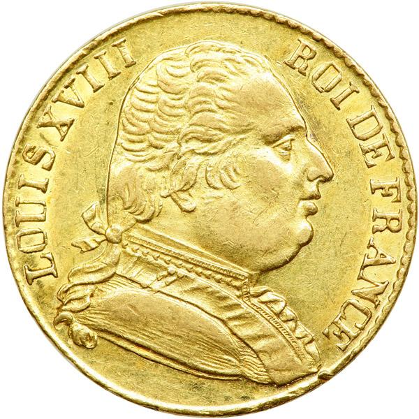 France. 20 Francs, 1815-R (London). Fr-531; KM-X1(707). Louis XVIII. Uniformed bust. Reverse: Arms. Struck in London during exile. NGC graded AU-55.