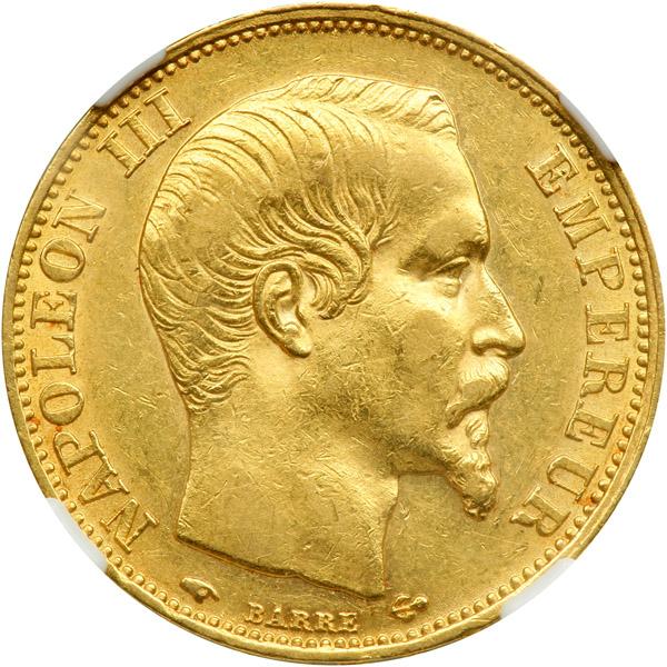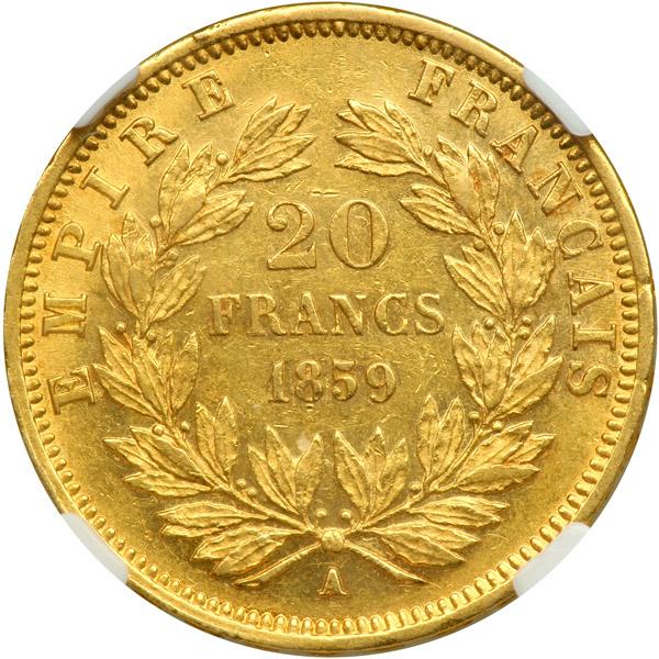 France. 20 Francs, 1859-A. Fr-573; KM-781.1. Weight 0.1867 ounce. Napoleon III. Bare head right. Reverse: Arms. NGC graded AU-50.