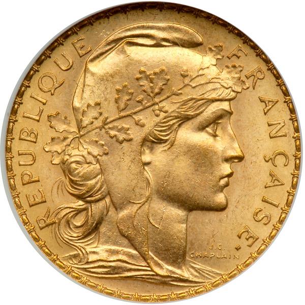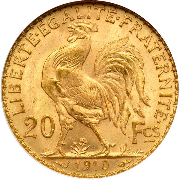 France. 20 Francs, 1910. Fr-596a; KM-857. Weight 0.1867 ounce. Rooster. NGC graded MS-66.