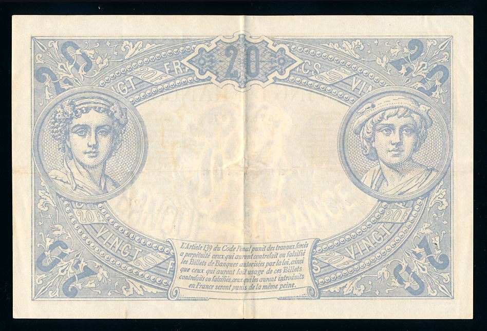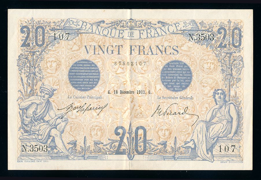 Banque de France, Twenty Francs, P.68b, 18.12.1912. Chocie VF-EF, with small 5mm split at bottom centre, on fold line. No pinholes. Crisp and bright.