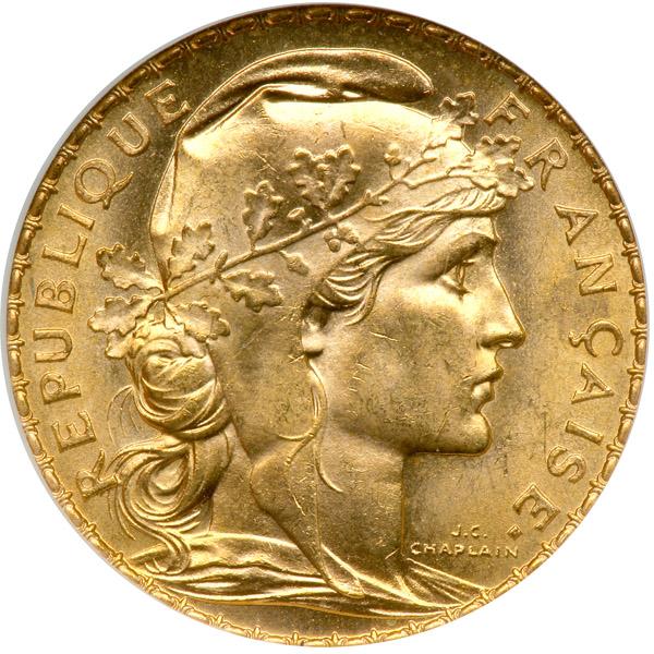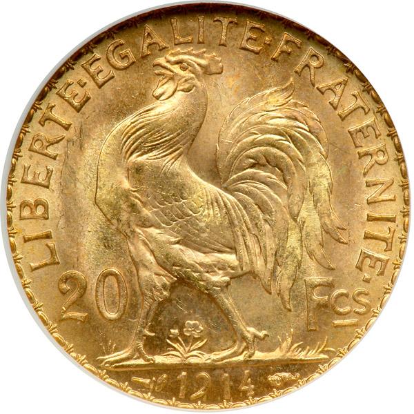 France. 20 Francs, 1914. Fr-596a; KM-857. Weight 0.1867 ounce. Rooster. NGC graded MS-66.