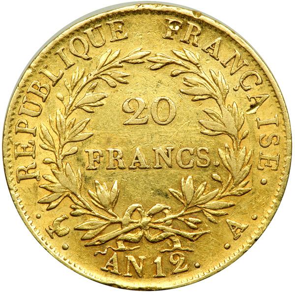 France. 20 Francs, AN 12-A. Fr-487; KM-661. Napoleon Empereur. Bare head left. NGC graded AU-53.