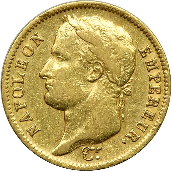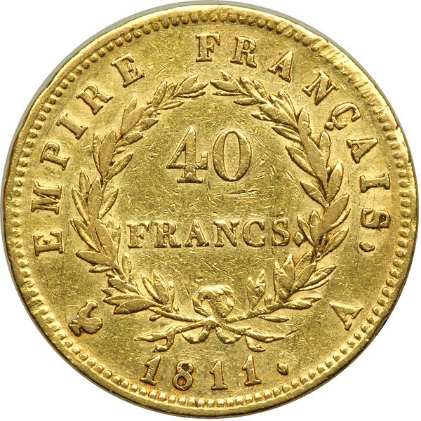 France. 40 Francs, 1811-A (Paris). Fr-505; KM-696.1. Weight 0.3734 ounce. Napoleon I. Laureate head. About Very Fine.