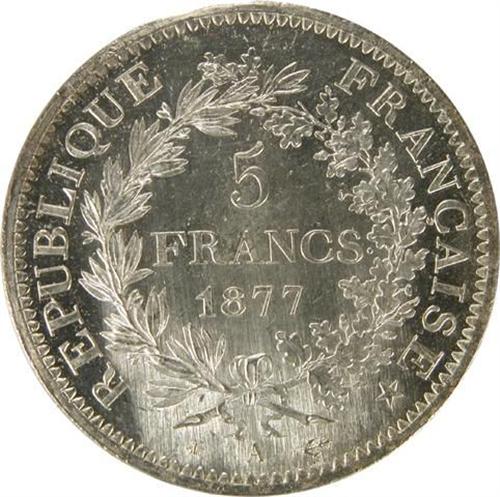5 Francs 1877A ICCS MS-64. Superbly lustrous and near untoned