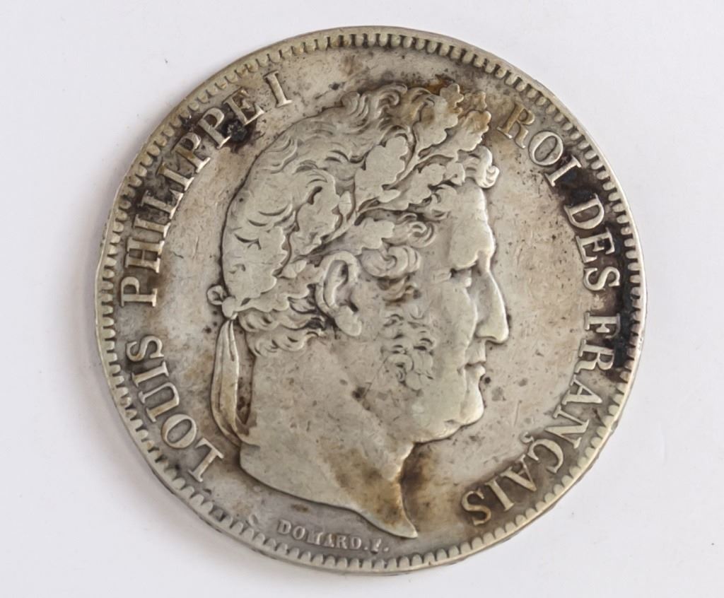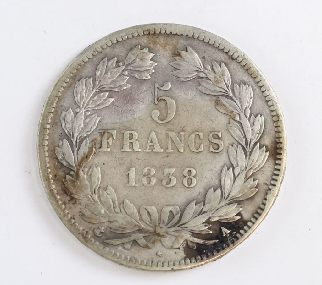 French coin. Portrait Louis-Philippe facing right. Lettering: LOUIS PHILIPPE I ROI DES FRANÇAIS / DOMARD.F. Reverse: Value and date within wreath. Lettering: 5 FRANCS / 1838 / A. Edge: ***DIEU PROTEGE LA FRANCE. Diameter: 4 cm. 24 grams.