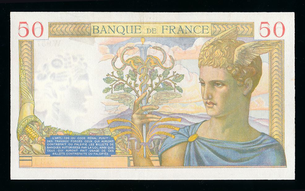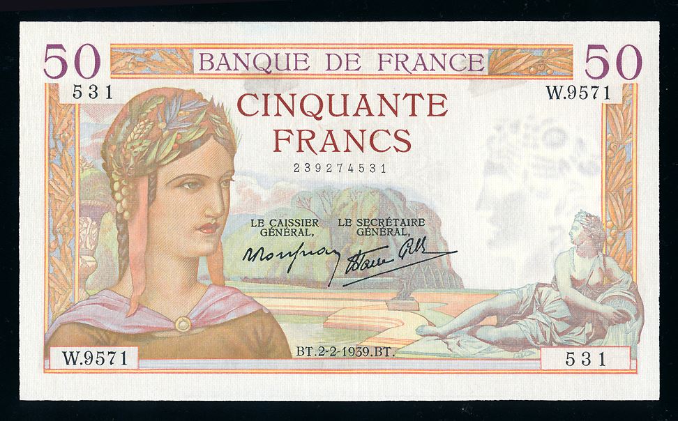 Banque de France, Fifty Francs, Ceres type, P.85b, 2.2.1939. Bright and clean VF-EF that looks better. No pinholes.