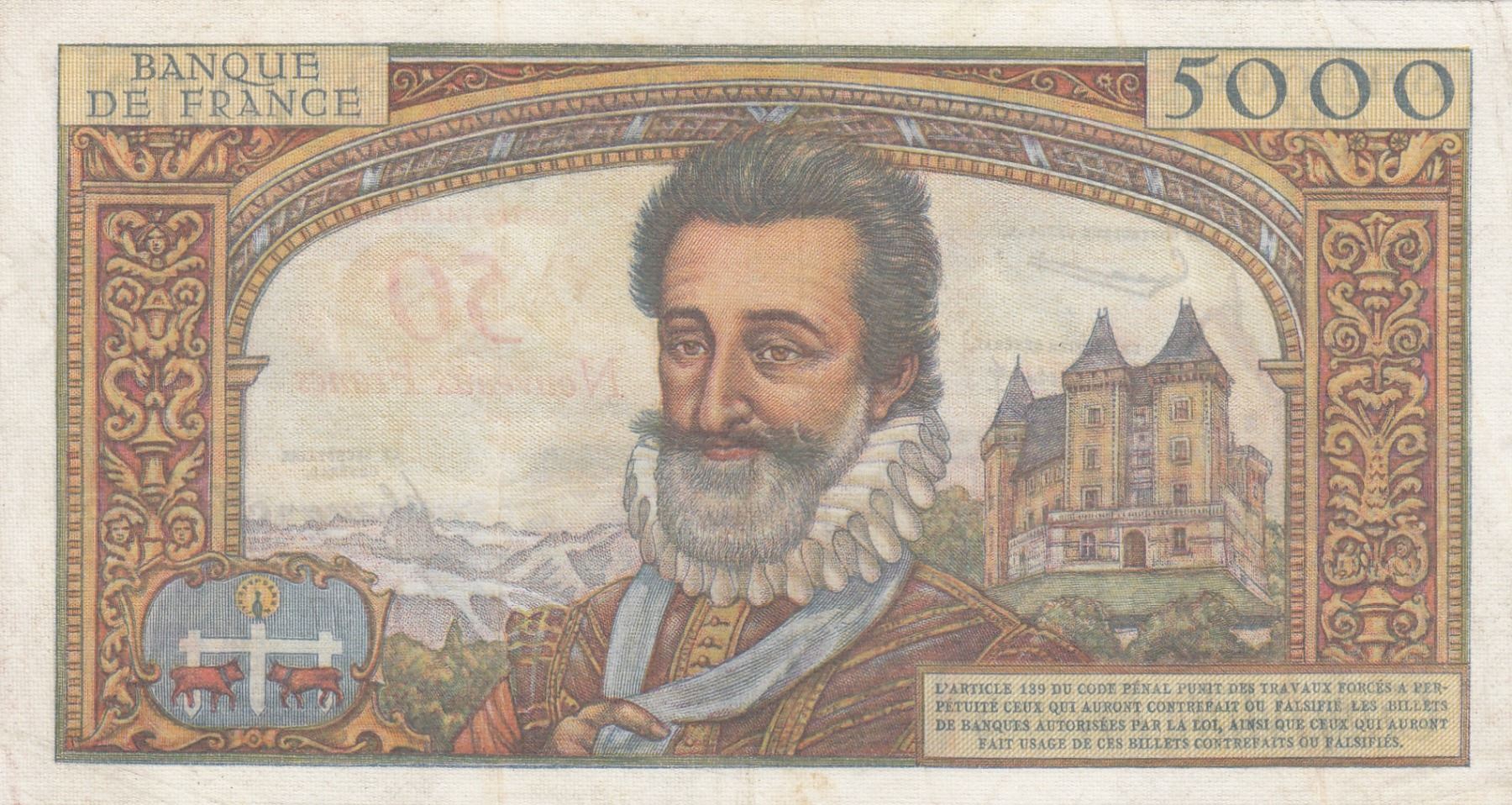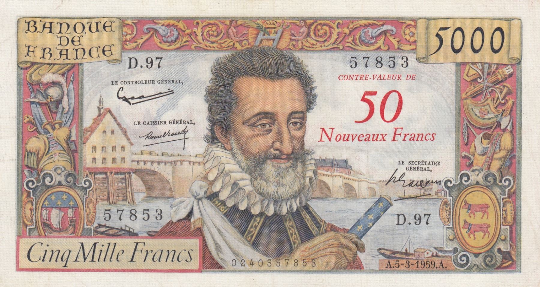 France, 50 New Francs (5000 Francs), 1959, XF, p130bbr/serial number: D.97.57853, pressed