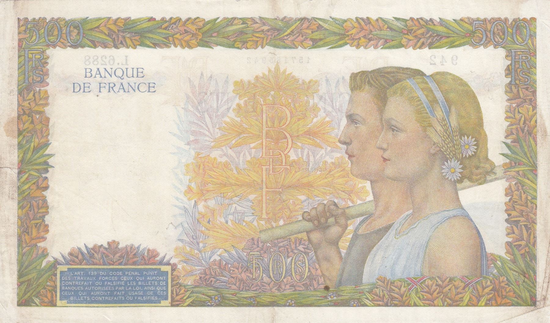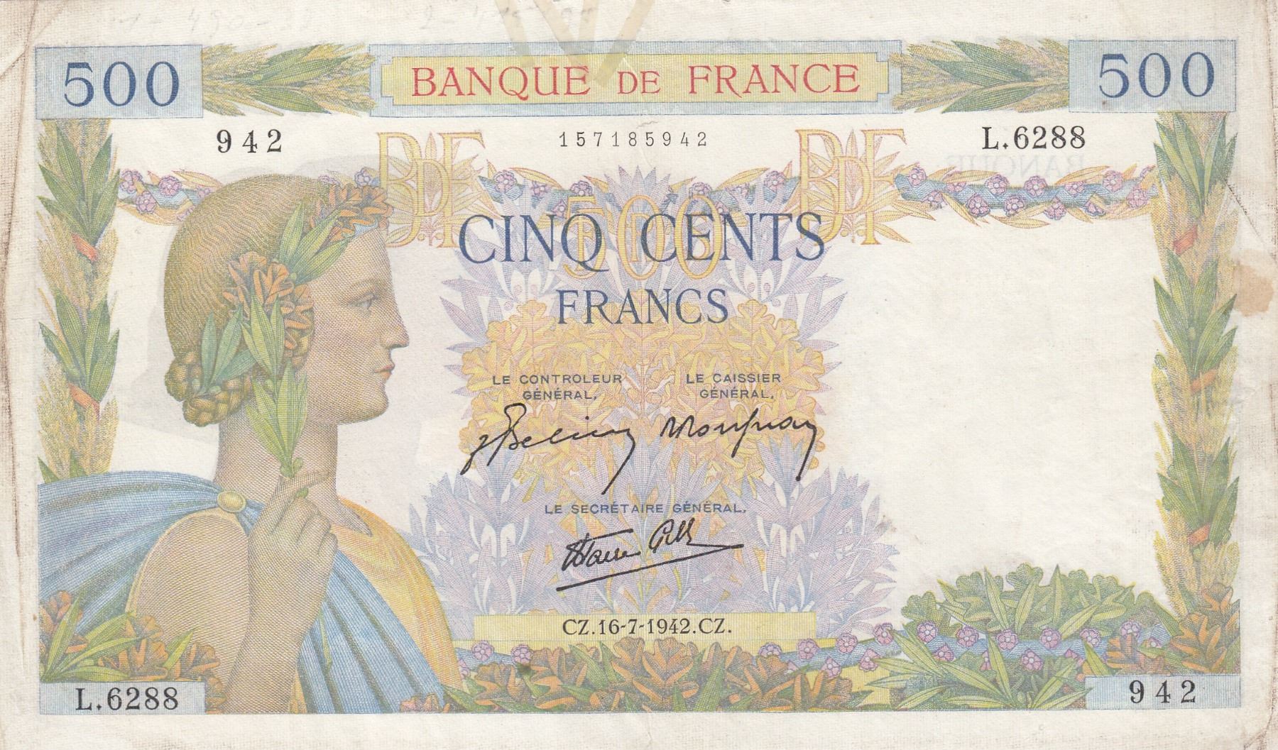 France, 500 Francs, 1942, VF, p95bbr/serial number: L.6288/942