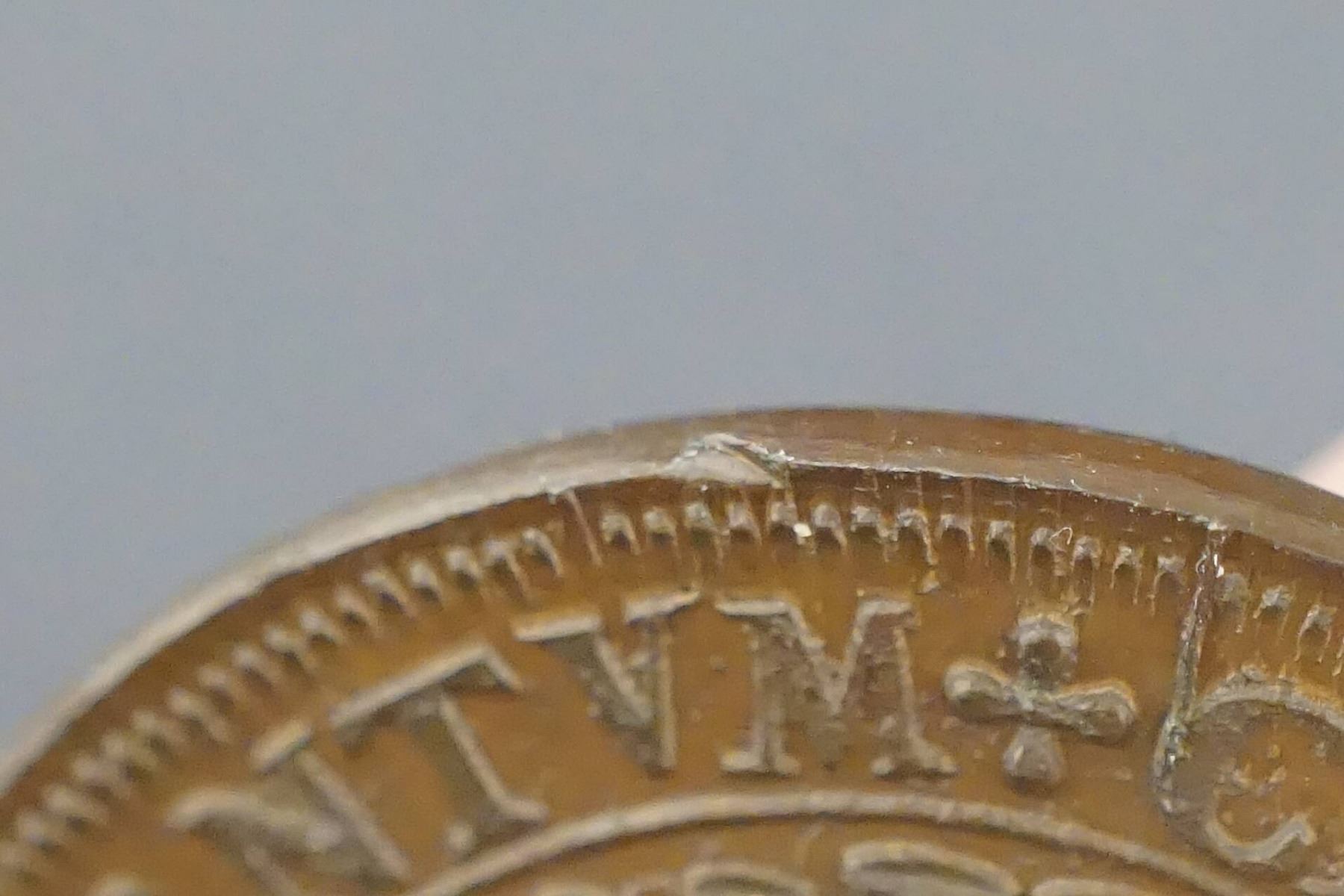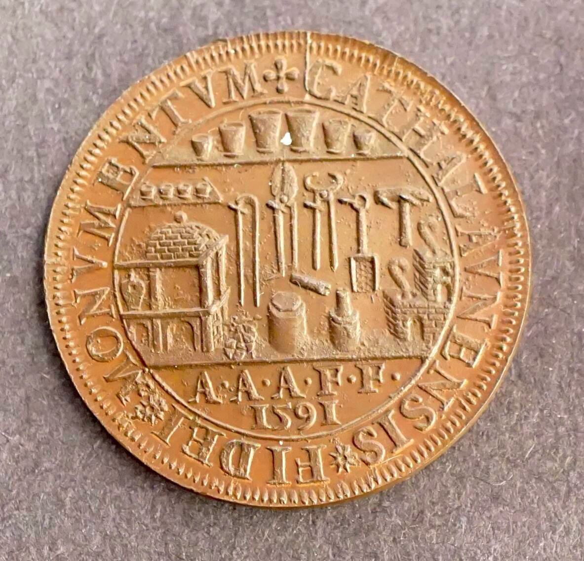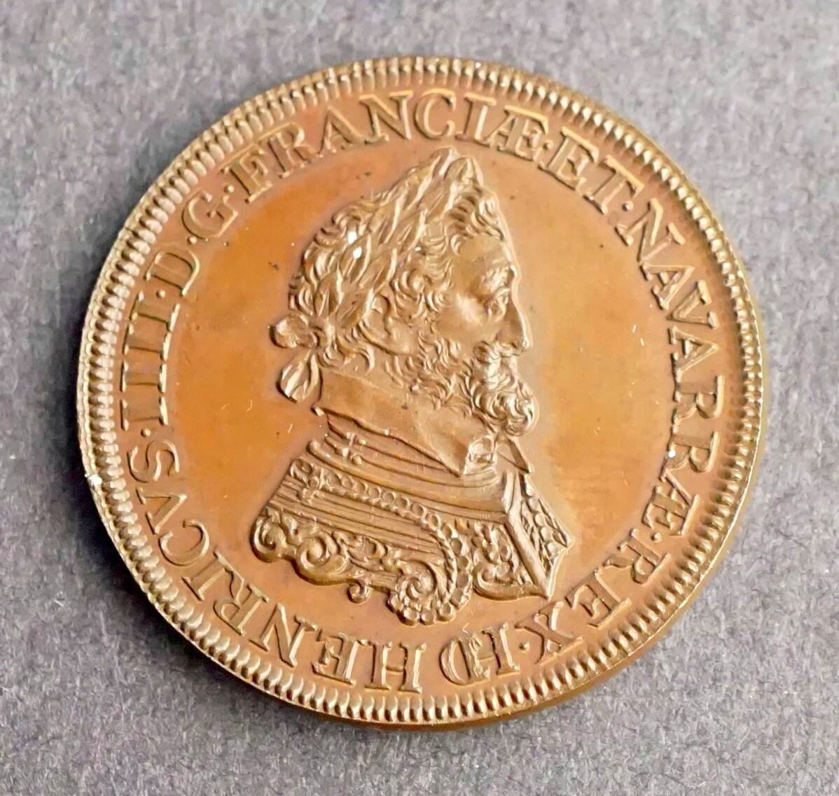 HENRICVS . IIII . D. G. FRANCIAE . ET NAVARR. REX . HD Portrait bust right. Reverse: Scene of tools and equipment B for striking coins, medals, Below, in two lines: A. A. A. F. F. 1591 CATHAL AVNENSIS FIDEI MONVMENTVM Reverse has a die crack near the top, and signs of die rusting most everywhere. The obverse is beautiful, in AU-UNC condition, with no evident die deterioration. This piece is most likely an 18th century restrike. Still, scarce and a very collectible medal. 35 mm, 20.6 grams.