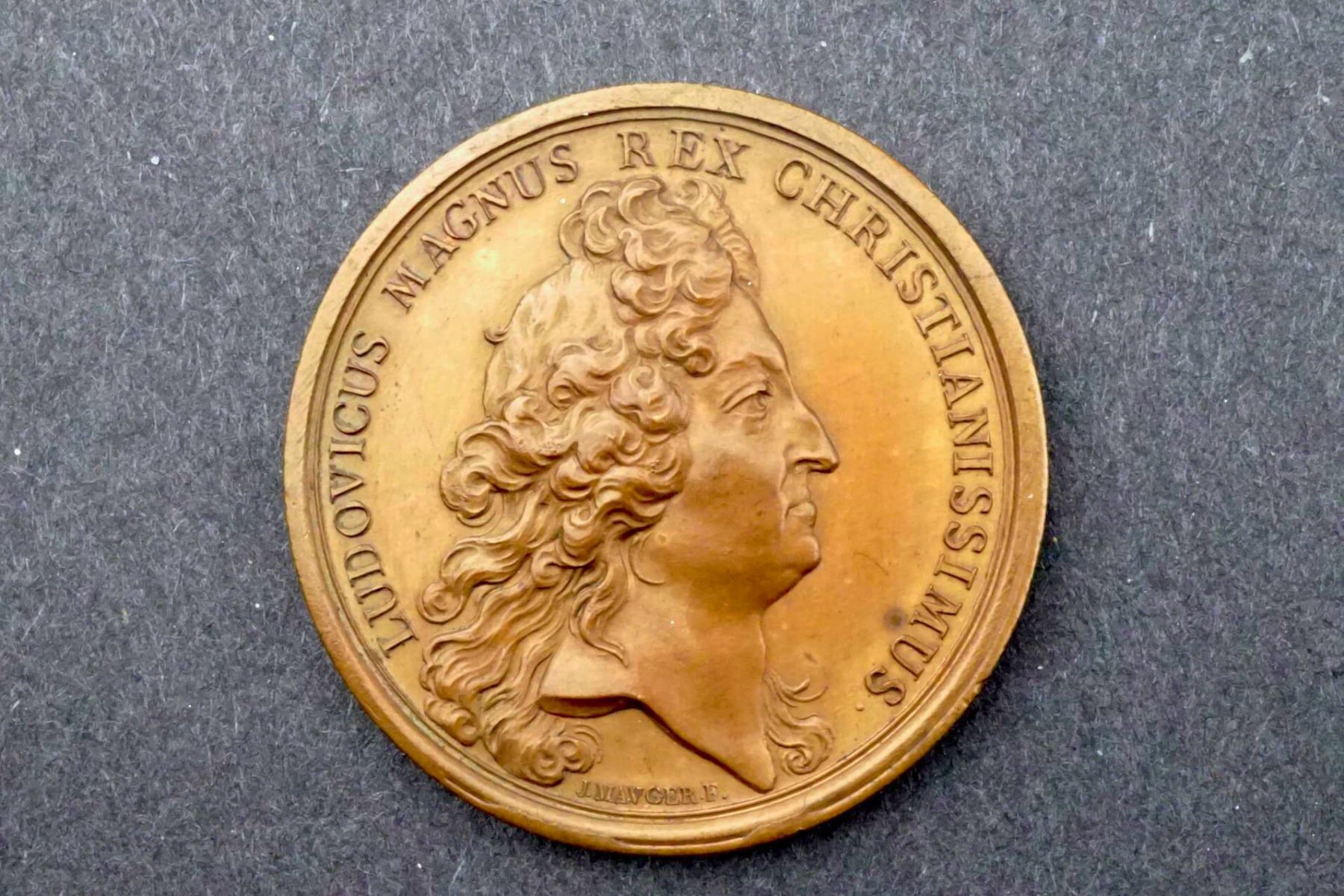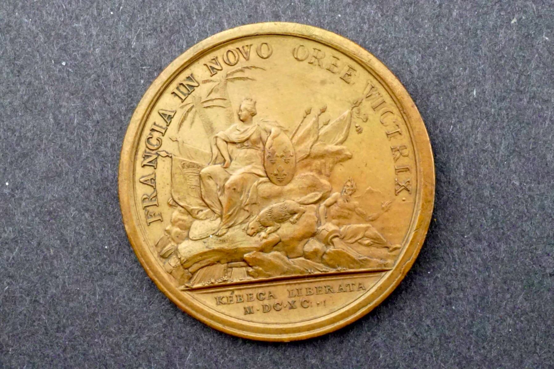 Paris Mint BRONZE mark on edge. 40 mm, 32.6 grams. LUDOVICUS MAGNUS REX CHRISTIANISSIMUS Bust of king, right. Signed: J. MAVGER. F. below bust. Reverse: FRANCIA IN NOVO ORBE VICTRIX France seated among various military and Canadian symbols. In exergue:KEBECA LIBERATA / M . DC . XC