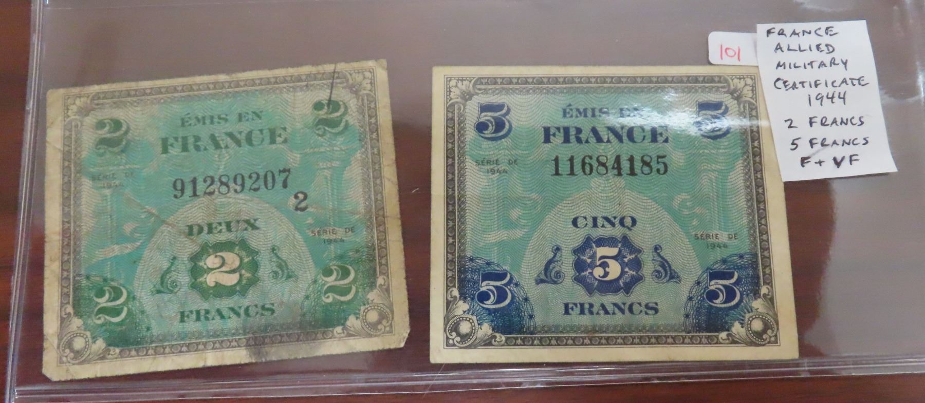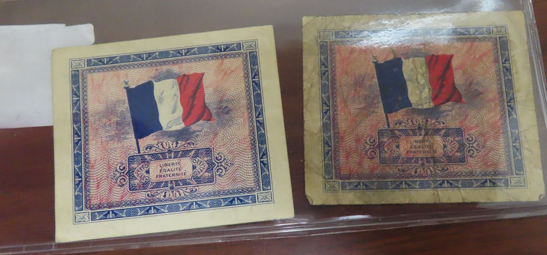 France. Allied Military Currency. Lot of 2 notes, both dated 1944, one for 2 Francs, the other for 5 Francs. Both with the French flag on the back. VG – F.