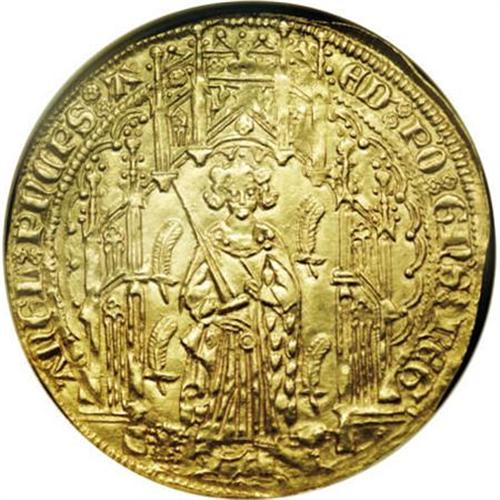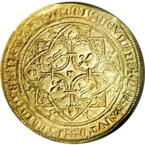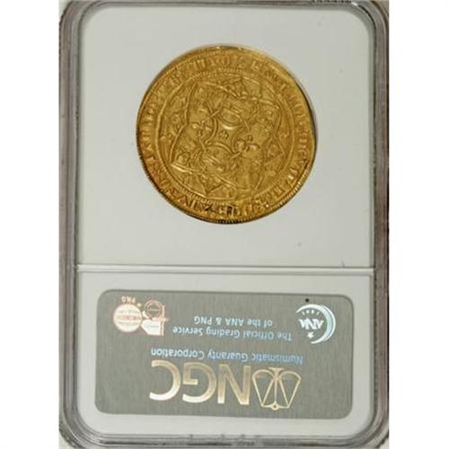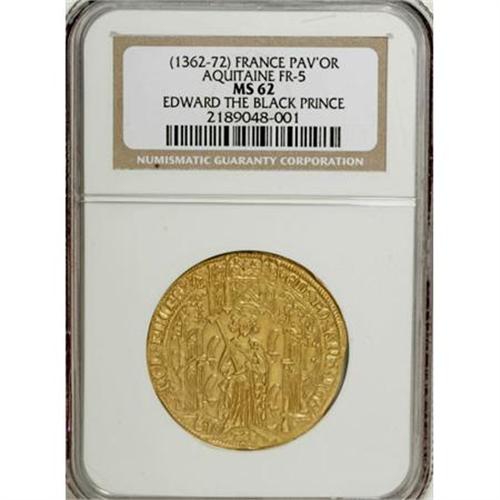 <B>Aquitaine. Edward Prince of Wales gold Pavillion d'Or ND (1362-72),</B></I> Friedberg 5, MS62 NGC, a magnificent example of this important rarity with fully struck details from rim to rim and no doubling. The design is meticulously executed and features "The Black Prince" standing under a Gothic canopy with sword drawn and two lions at his feet. The reverse design utilizes a foliate cross within a quadrangle with alternating leopards and lis in the angles. A true numismatic rarity in select quality.<BR><BR><b>Shipping:</b> Coins & Currency (<a target="_blank" href="http://www.heritageauctions.com/common/shipping.php">view shipping information</a>)
