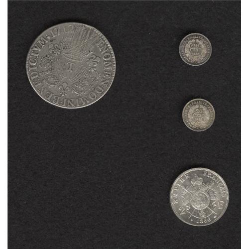 <B>Assortment of Silver Types, </B></I>Louis XIV Ecu 1712-T KM386.17, lightly toned VF with strong adjustment marks on both sides, Republic 20 Centimes 1850A KM758.1, two pieces, both superb toned UNC, very attractive multicolored patina, and Napoleon III 2 Francs 1866A KM807.1, fully brilliant AU-UNC. <B>Sold as is, no return lot.</B></I><BR><BR><b>Shipping:</b> Coins & Currency (<a target="_blank" href="http://www.heritageauctions.com/common/shipping.php">view shipping information</a>)