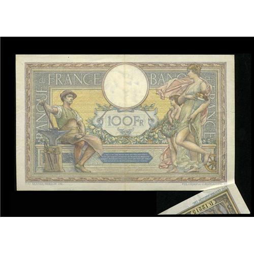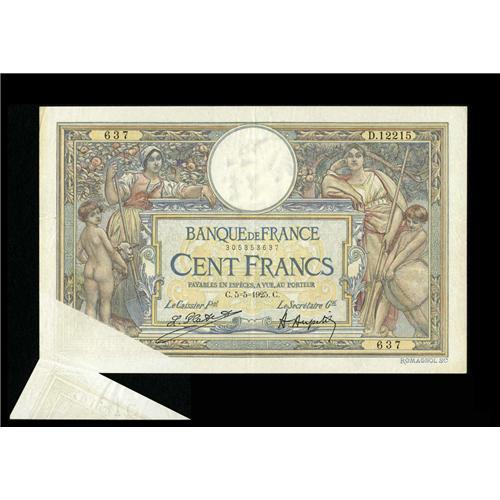 <B>France</B></I> Bank of France 100 Francs 5/5/1925 Pick 78a<BR>This pleasing <B>About Uncirculated</B></I> features a very eye catching cut & fold error. This is the first like it we have seen. A center fold is noticed on otherwise vibrant surfaces.<BR><BR><b>Shipping:</b> Coin/Currency (<a target="_blank" href="http://www.heritageauctions.com/common/shipping.php">view shipping information</a>)