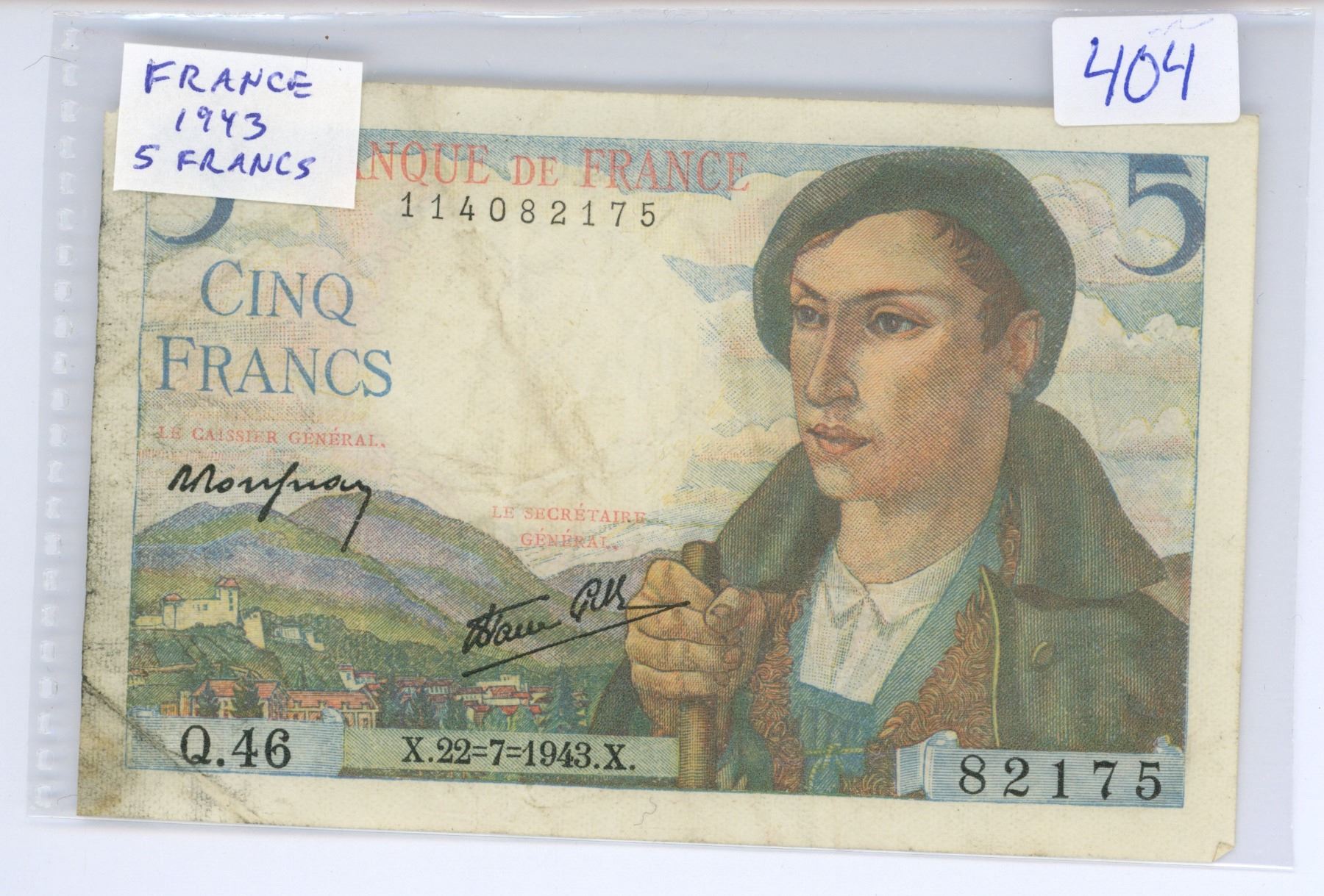 France. Bank of France. 1943 5 Francs. World War II issue. VF.