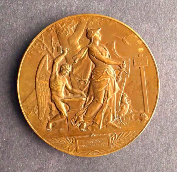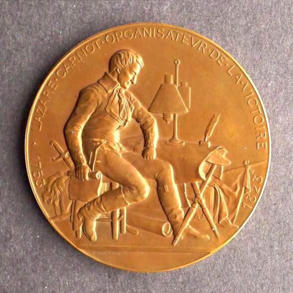 Paris mint mark CUIVRE on edge. 68 mm, 138.7 grams. Obverse: 1735 - 1823 LAZARE CARNOT ORGANISATVR DE LA VICTOIRE. Men at bench. Reverse: At left - Nude male angel at anvil, hammering a sword. At right: Martial woman, hand on hilt god sword, advancing towards signpost inscribed: REPVBLIQUE / FRANÇAISE. At center, behind, a tree. In exergue, a tablet reading: SALVS.POPVLI / SVPREMA LEX ESTA.