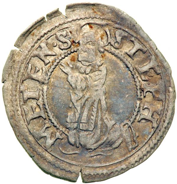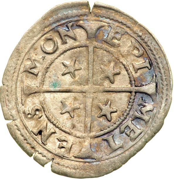 France. Bishopric of Metz. Denier. Roberts-8930. Weight 0.84 grams. Robert of Lenoncourt, 1551-1553. Obverse: Long cross to edges. Inner beaded circle with star in field in each quidrant of the cross. Legend: MON EPI MET ENS. Reverse: Full length figure within inner circle extending to outer circle at 12 and 6 o'clock. Legend: S - STEPH - METEN. Very Fine.