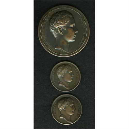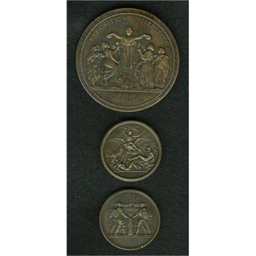 <B>France Bronze Medals Paris Mint Restrikes Circa 1869.</B></I> Bronze, 70 mm, 147.7 gm. Struck for the Universal Exposition in Paris, the medal features the bust of Eugene Louis Napoleon, Prince Imperial. The obverse is the work of Barre and is signed below the bust (Barre 1869). The reverse is the work of Vauthier Galli. The medal appears to have been struck from rusted dies, indicating a later striking. Also included are two bronze (edge-stamped) 41-mm, 36.3-gm portrait medals of Napoleon "Emp. Et. Roi." Both pieces have the same obverse but different themes on the reverse.<BR><BR><b>Shipping:</b> Coins & Currency (<a target="_blank" href="http://www.heritageauctions.com/common/shipping.php">view shipping information</a>)