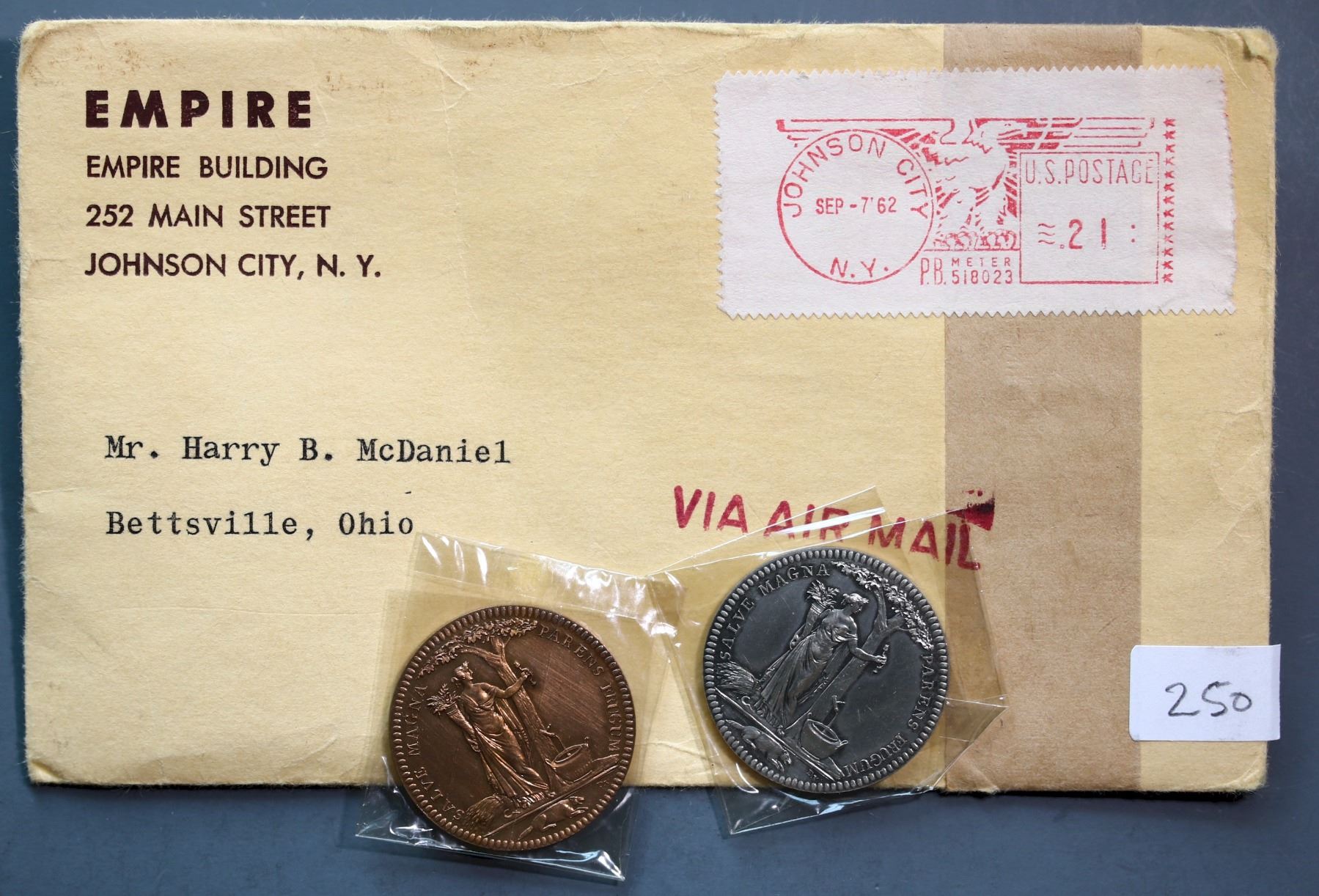 France; Castorland 1796 Token, Bronze Paris restrike, Franco-Americana Colonial. Lot of 2 pcs in original mailing envelope from The Empire Building 252 Main St in NY.