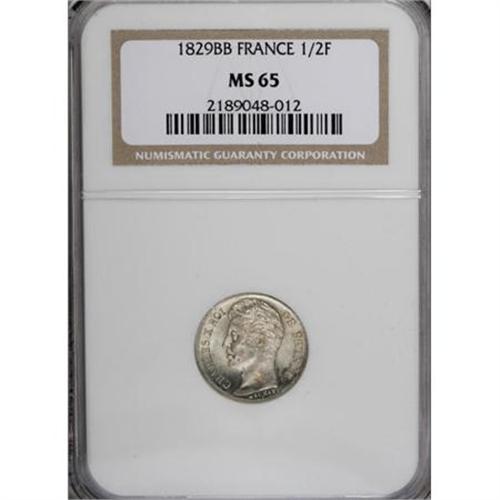 <B>Charles X 1/2 Franc 1829-BB,</B></I> KM723.3, MS65 NGC, a Gem quality coin with brilliant mint luster and just a hint of subtle patina in the legends. Very rare in this lofty designation.<BR><BR><b>Shipping:</b> Coins & Currency (<a target="_blank" href="http://www.heritageauctions.com/common/shipping.php">view shipping information</a>)