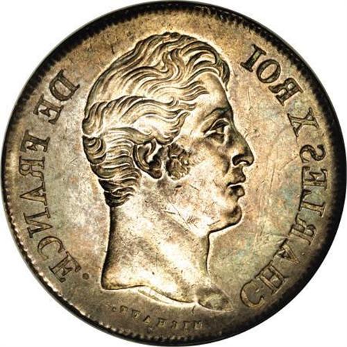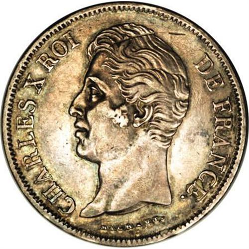 <B>Charles X 5 Francs Brockage Mint Error,</B></I> KM728, toned XF, full brockage with the incuse obverse design on the reverse. Very rare and dramatic mint error, particularly for this large denomination.<BR><BR><b>Shipping:</b> Coins & Currency (<a target="_blank" href="http://www.heritageauctions.com/common/shipping.php">view shipping information</a>)