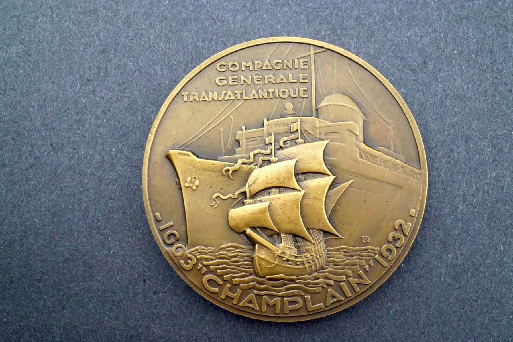 Commemorative Bronze Medal 1603 - 1932 Signed: Raymond Delamarre. Obverse depicts the standing figure of Champlain "ORBI ANTIQVO NOVVUM CONJUNGITON". The Reverse: A modern ocean liner, with Champlain's shim superimposed. Company name above, 1603 - CHAMPLAIN - 1932 below. Paris mint BRONZE mark on edge. 68 mm, 146.8 grams.