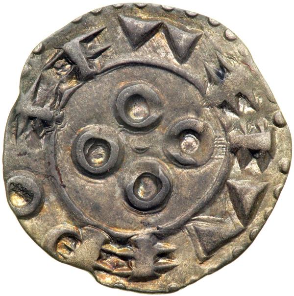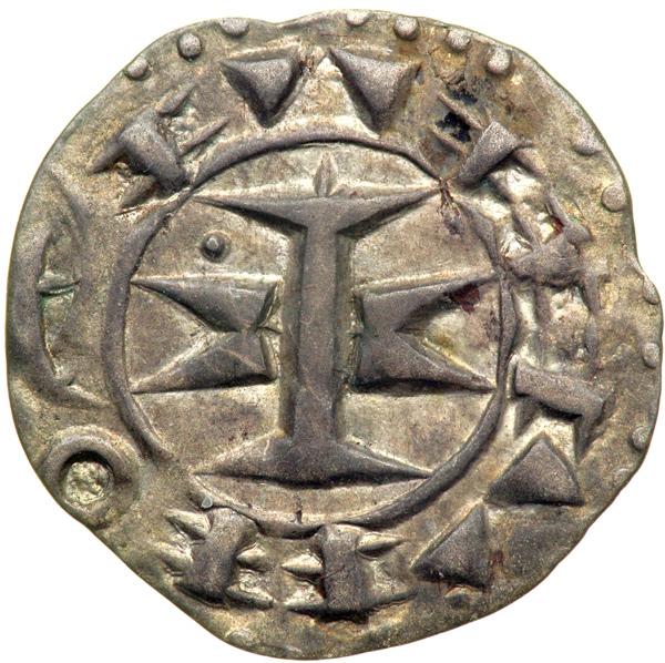 France. Counts (Bishops) of Maguelonne (11-13th Century). Denier. Roberts-4336. Weight 1.03 grams. Obverse: Pile between two iron hoofs with pellet left. Leg: RAMUND. Reverse: Four annulets with pellet in center. Leg: NARBONA. Extremely Fine.
