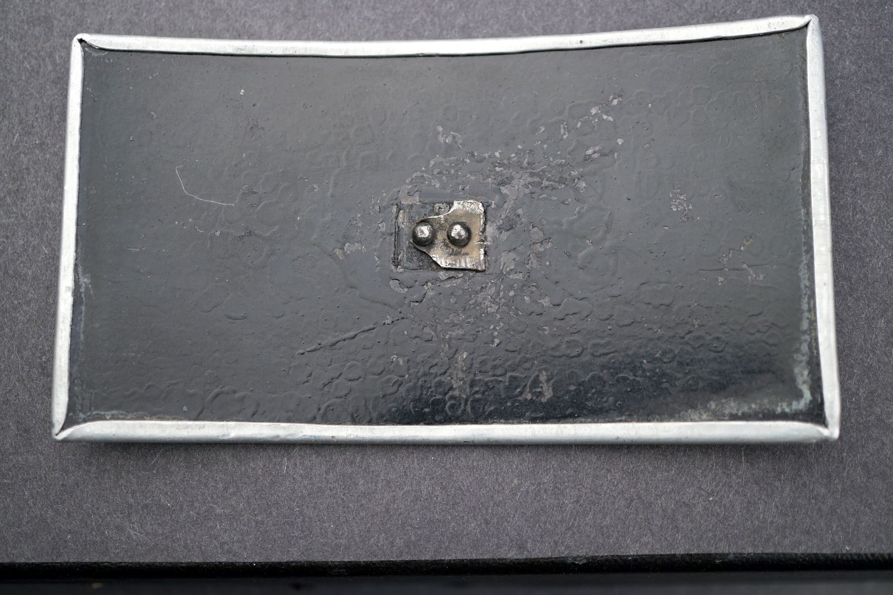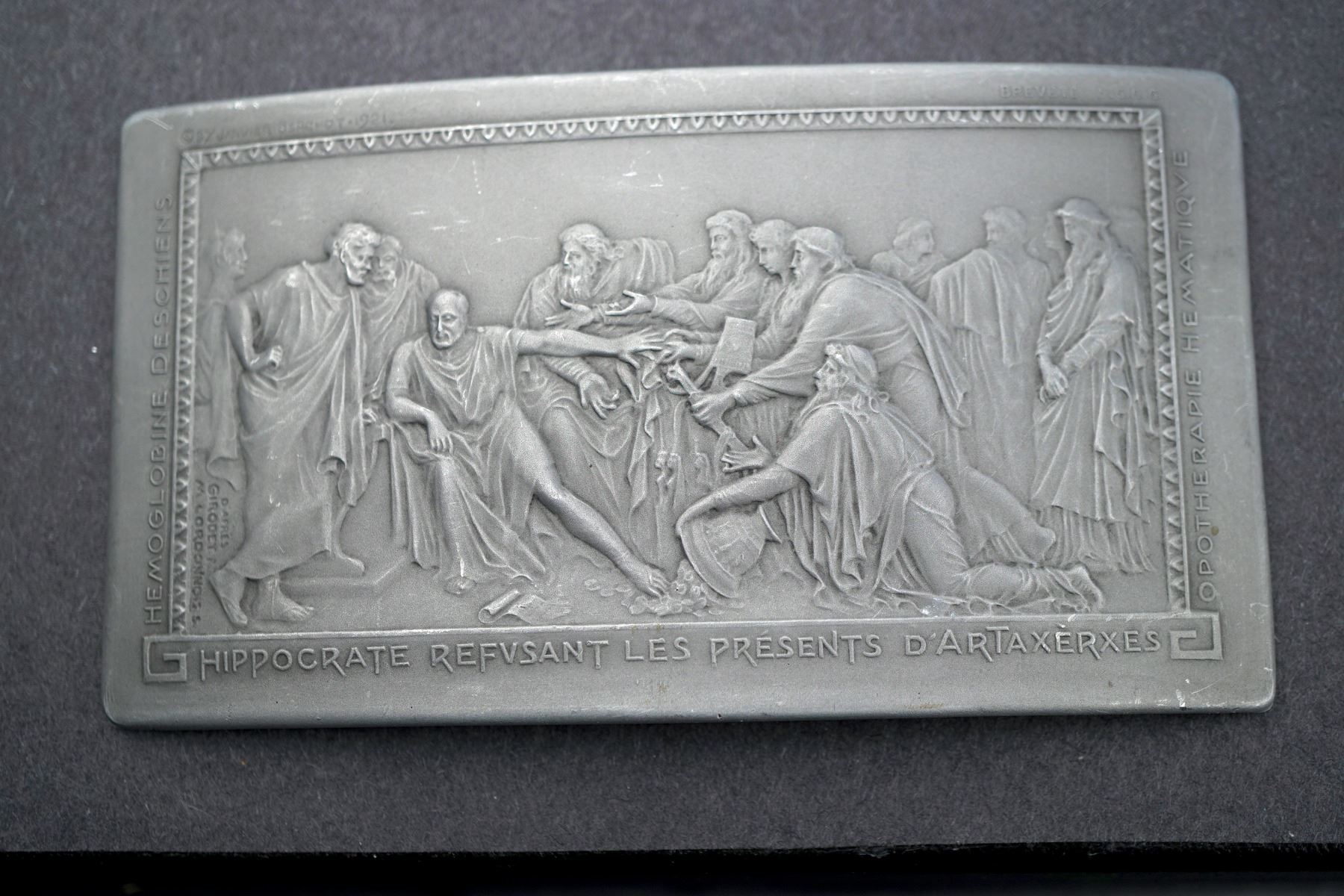 France - Curved Rectangular Medallic Repousse Plaque - Scene of Hippocrates refusing Gifts from the Persian King Artaxerxes. Signed: B. Janvier Berchot 1921 in upper left. Text to left: HEMOGLOBINE DESCHIENS. To right: OPOTHERAPIE HEMATIQVE. This is a curved plaque in white metal or aluminium, apparently reinforced with steel. It measures 61 x 112 mm. The text at bottom reads: HIPPOCRATE REFVSANT LES PRESENTS D'ARTAXERXES Persian king and his courtiers attempting to offer gifts to Hippocrates, the Greek originator of scientific medicine, In the lower left: D'APRES / GIRODET F. / M. LORDODONO S. The black back ink has remnants of a hook or attachment.