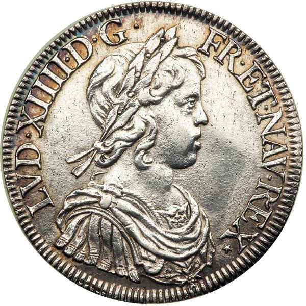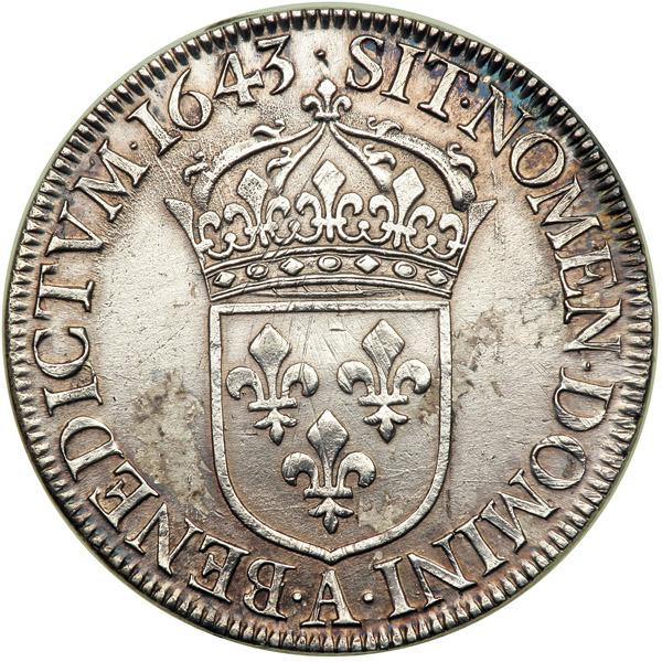 France. Ecu, 1643-A. Dav-3798; KM-144.3; Gad-201. Variety with point. Louis XIV. Bust with short curl right. Reverse: Crowned arms. NGC graded About Uncirculated, Details (Polished).