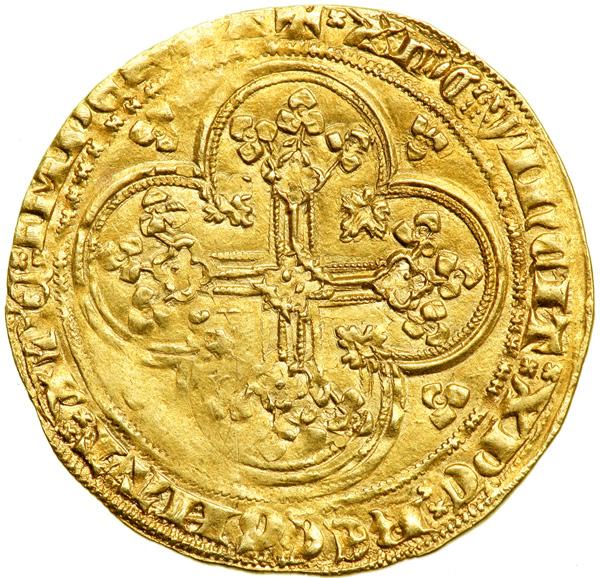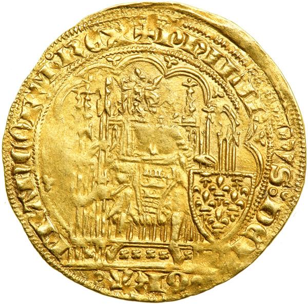 France. Ecu d'or, ND. Fr-270. Philippe VI De Valois, 1328-1350. King with sword and shield, seated on Gothic throne. Reverse: Floriated cross in quadrilobe. King's face double struck. NGC graded EF-45.