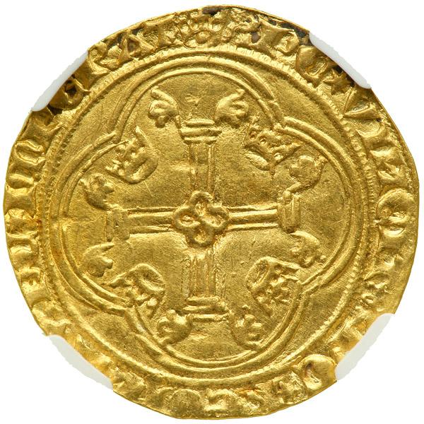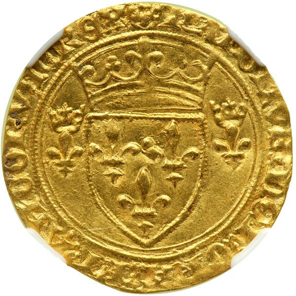 France. Ecu d'or neuf a la couronne, ND. Fr-307. Charles VII, 1422-1461. Crowned arms of France flanked by two crowned fleurs de lis. Reverse: Floriated cross in quadrilobe, a crown in each angle. NGC graded AU-55.