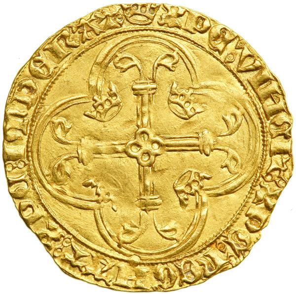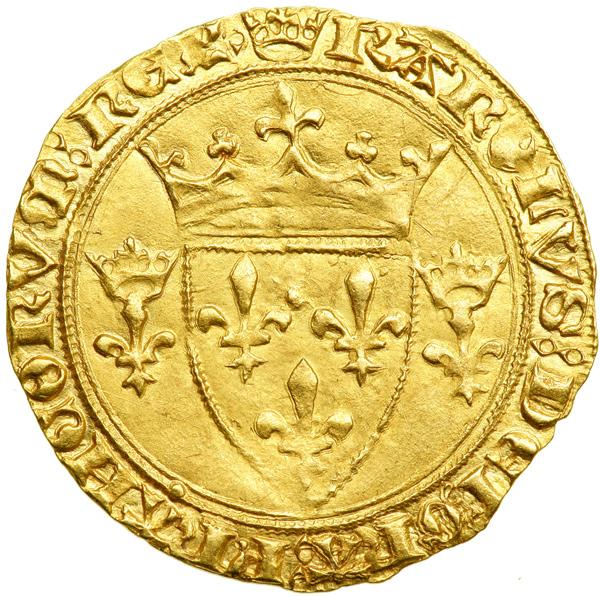 France. Ecu d'or neuf a la couronne, ND. Fr-307. Charles VII, 1422-1461. Crowned arms of France flanked by two crowned fleurs de lis. Reverse: Floriated cross in quadrilobe, a crown in each angle. Lustrous. NGC graded AU-58.