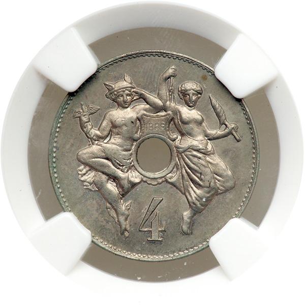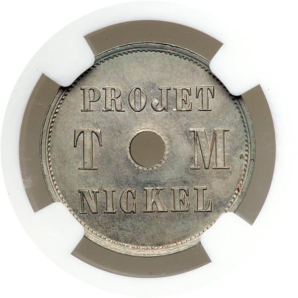 France. Essai 4 Centimes, 1889. Maz-2318. Nickel. Figures with value 4 below. Reverse: PROJET / TM / NICKEL. Center hole. NGC graded MS-64.