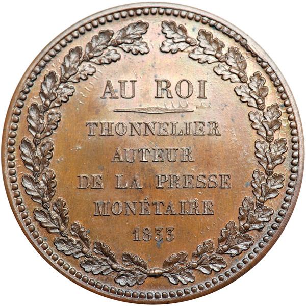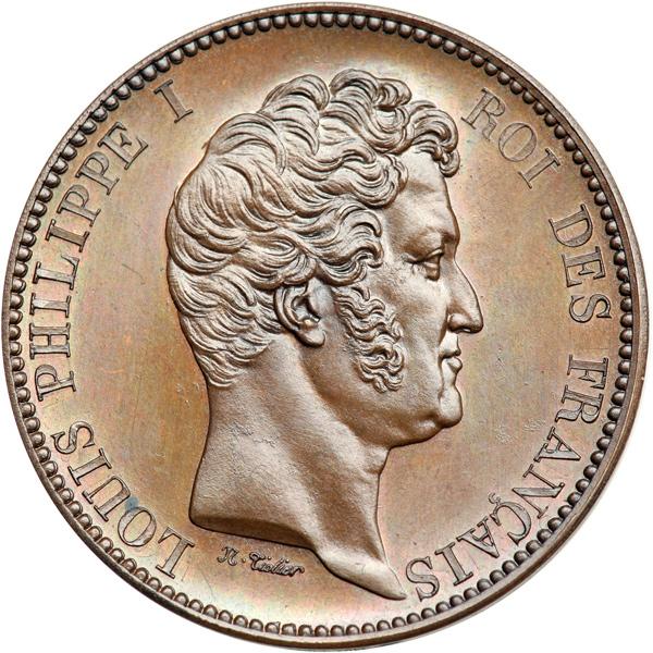 France. Essai 5 Francs, 1833. Maz-1152. Bronze. 37.5 mm. by Tiolier. Louis Philippe I. Bust right. Reverse: Legend in wreath. Demonstration piece of Thonnelier's coin press, dedicated to the king. NGC graded MS-65 Brown.