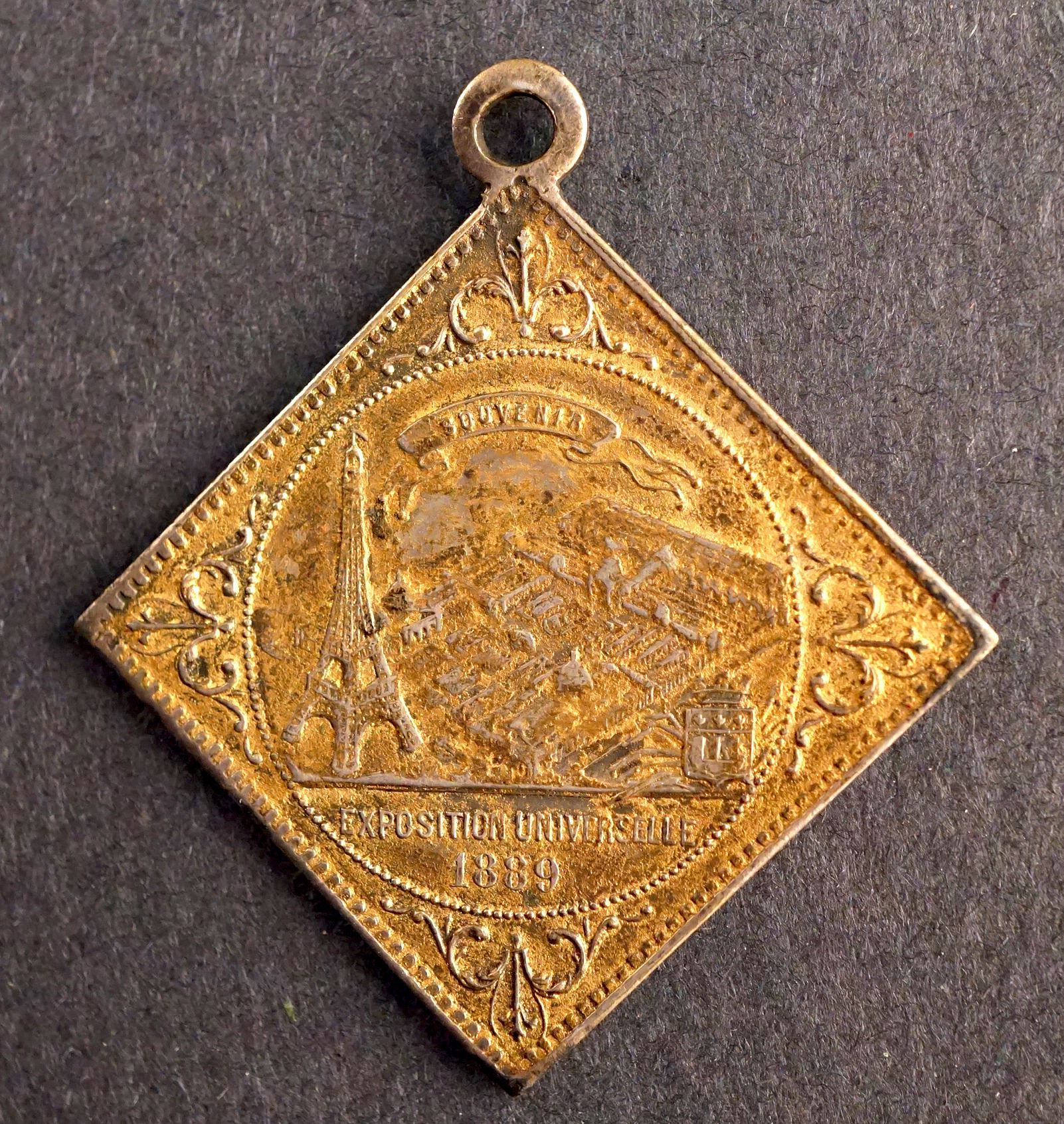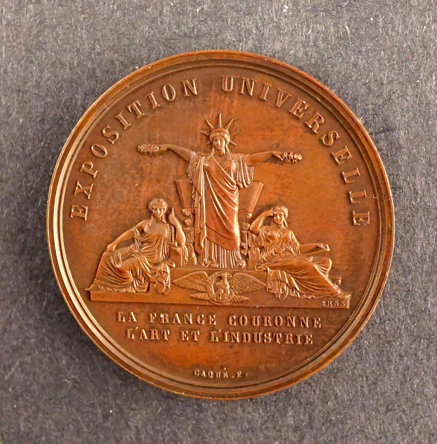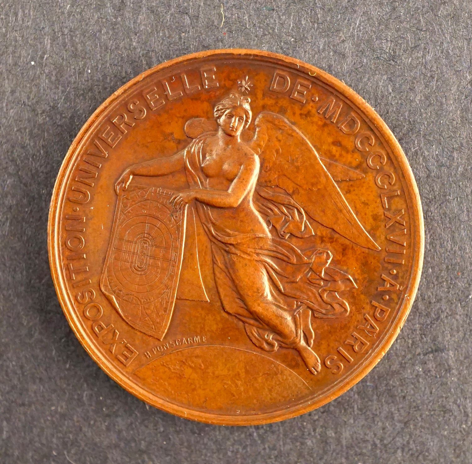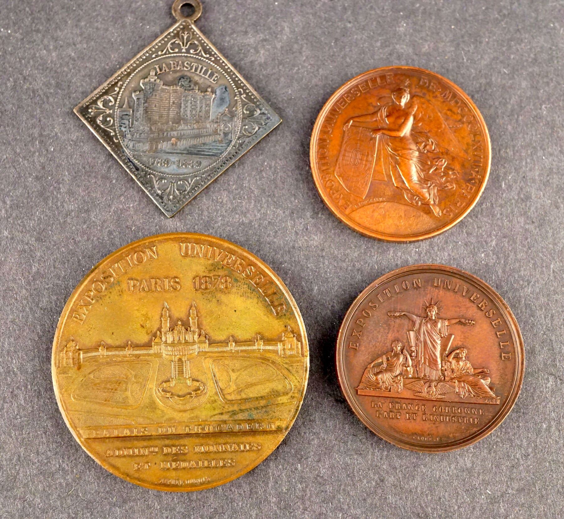 1) Obverse: NAPOLEON III EMPEREUR Laureate bust left. Signed: E.A. OUDINÉ below. Reverse: EXPOSITION UNIVERSELLE Robed woman standing, facing, arms outstretched, with a wreath in each hand. Below her, the Imperial eagle and wreath, To left and right, seated women. On the lower right of the ground line: 1855. In exergue: LA France COURONNE / L'ART ET L'INDUSTRIE. Signed at bottom: CAQUÉ. F. Gem condition, with glossy fields. 37 mm. 22.1 grams, Paris Mint BRONZE mark on edge. 2) Obverse: NAPOLEON IIIEMPEREUR Laureate bust left. Signed: N. PONSCARME F. Reverse "EXPOSITION UNIVERSELLE DE MDCCCLXVII A PARIS". Angel flying left, holding small designed carpet. Below, a small view of the planet. Signed: H. POCSCARME, 37 mm, 22.0 grams. Paris mint mark BRONZE on the edge. Condition is Gem Ung, with highly glossy surfaces. 3) Obverse: REPUBLIQUE FRAÇAISE Bust of Ceres, left. Signed: OUDINÉ. Reverse: EXPOSITION UNIVERSELLE PARIS 1878, Scene of the exposition grounds. In exergue: ADMINISTRATION DES MONNAIES / ET MÉDAILLES. Signed below: ALPHÉE DUBOIS, 50 mm, 58.1 grams. Condition is UNC. 4) Diamond form Souvenir medallion Exposition Universelle 1889, scene of exposition grounds / the Bastille 1789 - 1889. 31 x 31 mm, suspension hook at corner. White metal, 10.1 grams.
