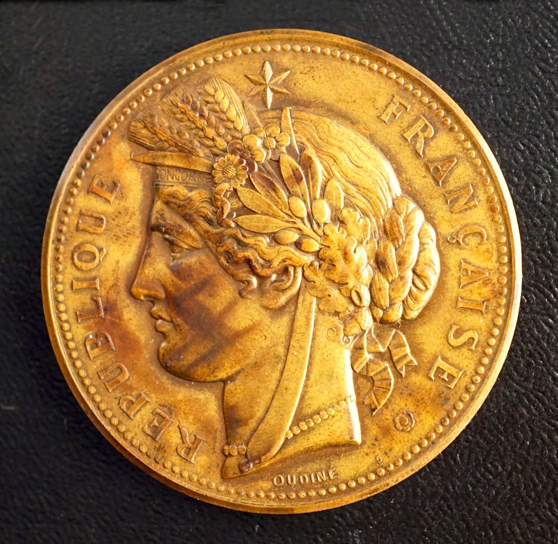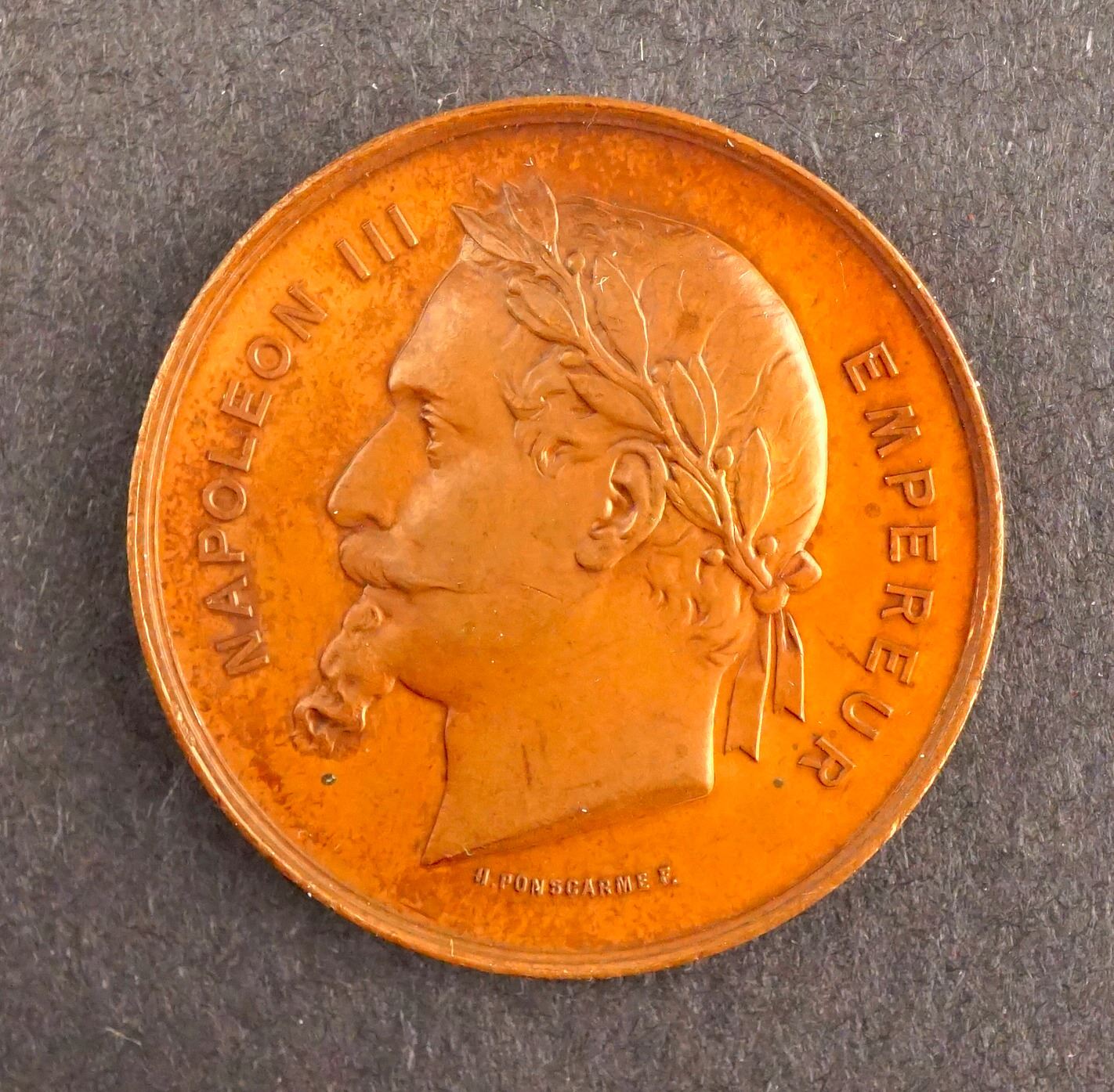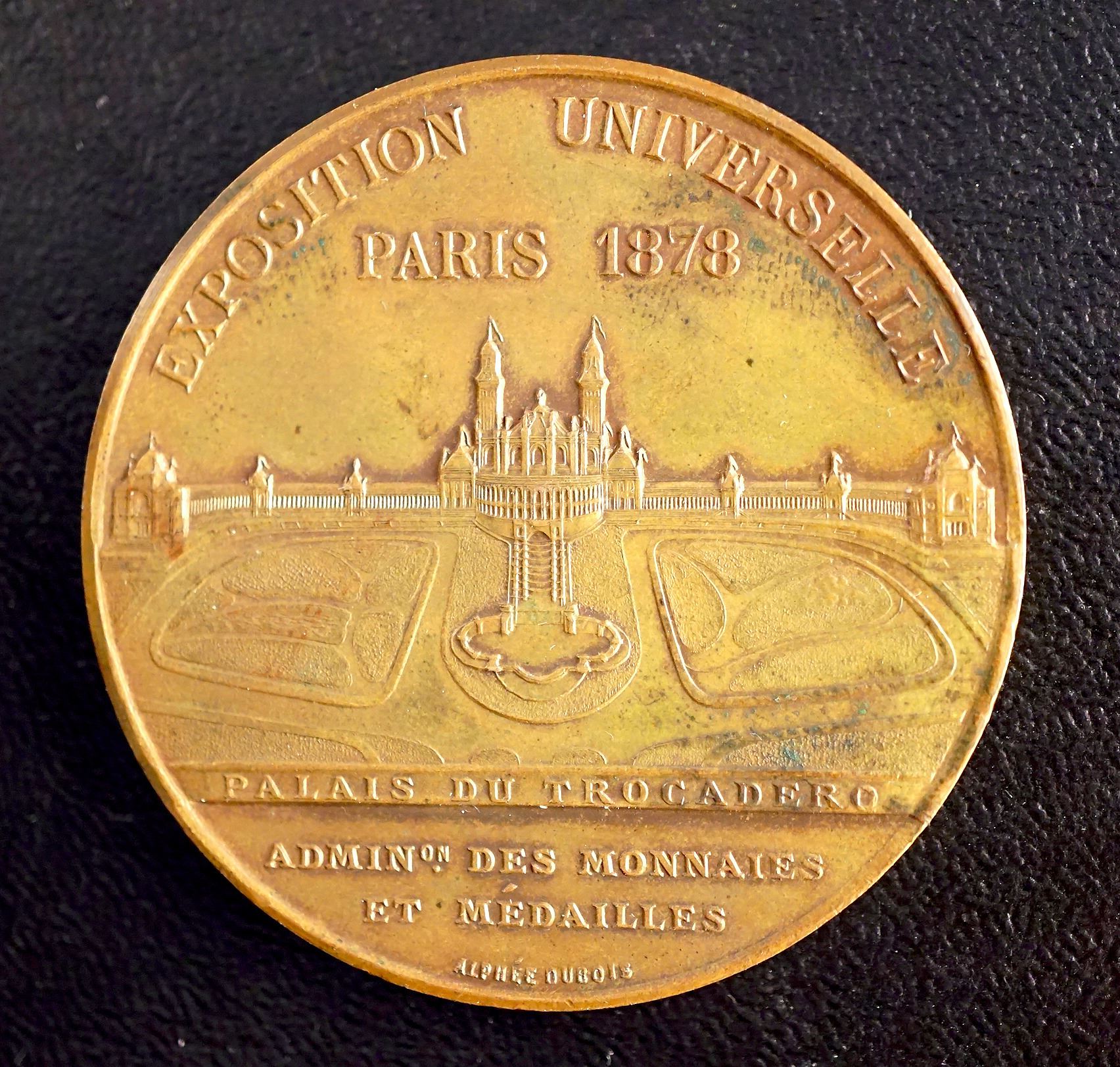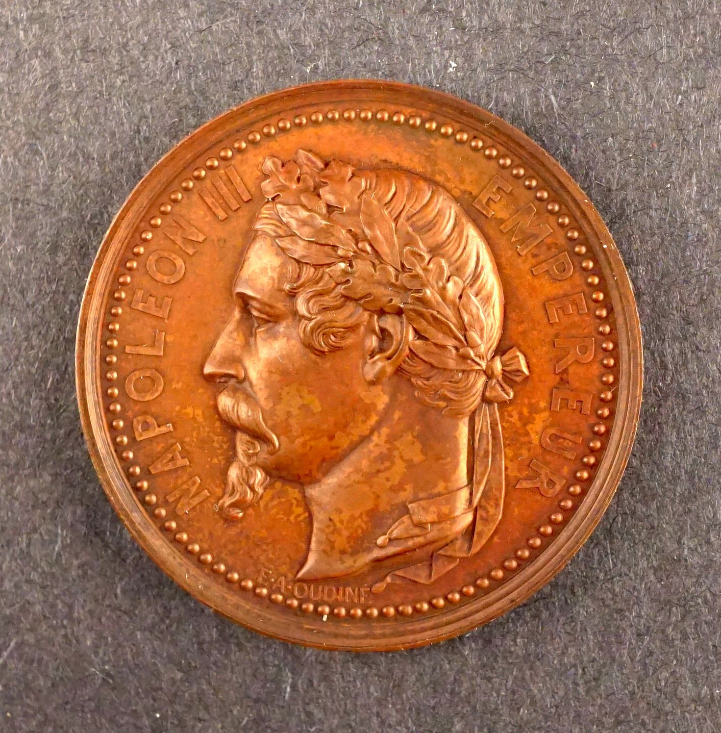 1) Obverse: NAPOLEON III EMPEREUR Laureate bust left. Signed: E.A. OUDINÉ below. Reverse: EXPOSITION UNIVERSELLE Robed woman standing, facing, arms outstretched, with a wreath in each hand. Below her, the Imperial eagle and wreath, To left and right, seated women. On the lower right of the ground line: 1855. In exergue: LA France COURONNE / L'ART ET L'INDUSTRIE. Signed at bottom: CAQUÉ. F. Gem condition, with glossy fields. 37 mm. 22.1 grams, Paris Mint BRONZE mark on edge. 2) Obverse: NAPOLEON IIIEMPEREUR Laureate bust left. Signed: N. PONSCARME F. Reverse "EXPOSITION UNIVERSELLE DE MDCCCLXVII A PARIS". Angel flying left, holding small designed carpet. Below, a small view of the planet. Signed: H. POCSCARME, 37 mm, 22.0 grams. Paris mint mark BRONZE on the edge. Condition is Gem Ung, with highly glossy surfaces. 3) Obverse: REPUBLIQUE FRAÇAISE Bust of Ceres, left. Signed: OUDINÉ. Reverse: EXPOSITION UNIVERSELLE PARIS 1878, Scene of the exposition grounds. In exergue: ADMINISTRATION DES MONNAIES / ET MÉDAILLES. Signed below: ALPHÉE DUBOIS, 50 mm, 58.1 grams. Condition is UNC. 4) Diamond form Souvenir medallion Exposition Universelle 1889, scene of exposition grounds / the Bastille 1789 - 1889. 31 x 31 mm, suspension hook at corner. White metal, 10.1 grams.