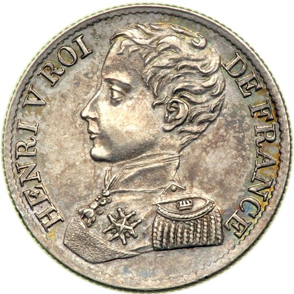 France. Franc, 1831. Maz-911C; KM-X#28.2. Silver. Reeded edge. Henry V, Pretender coinage. Bust left. Reverse: Arms. Toned. NGC graded AU-55.