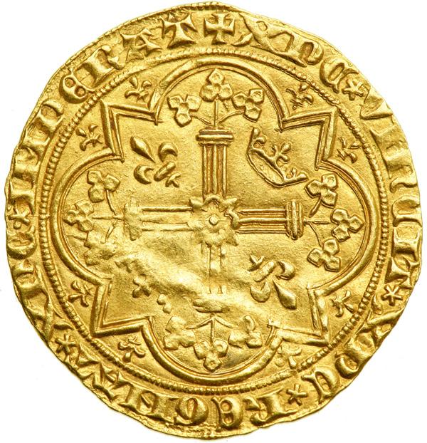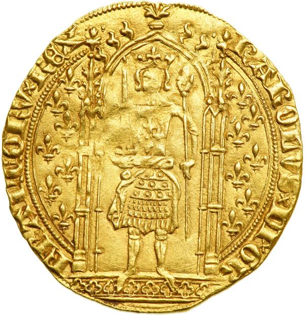 France. Franc a Pied, ND. Fr-284. Charles V, 1364-1380. Armored king with sword and sceptre, standing under Gothic dais. Reverse: Floriated cross in quadrilobe fleur de lis in two angles, crown in two angles. Creased and bent. NGC graded Extremely Fine, Details.