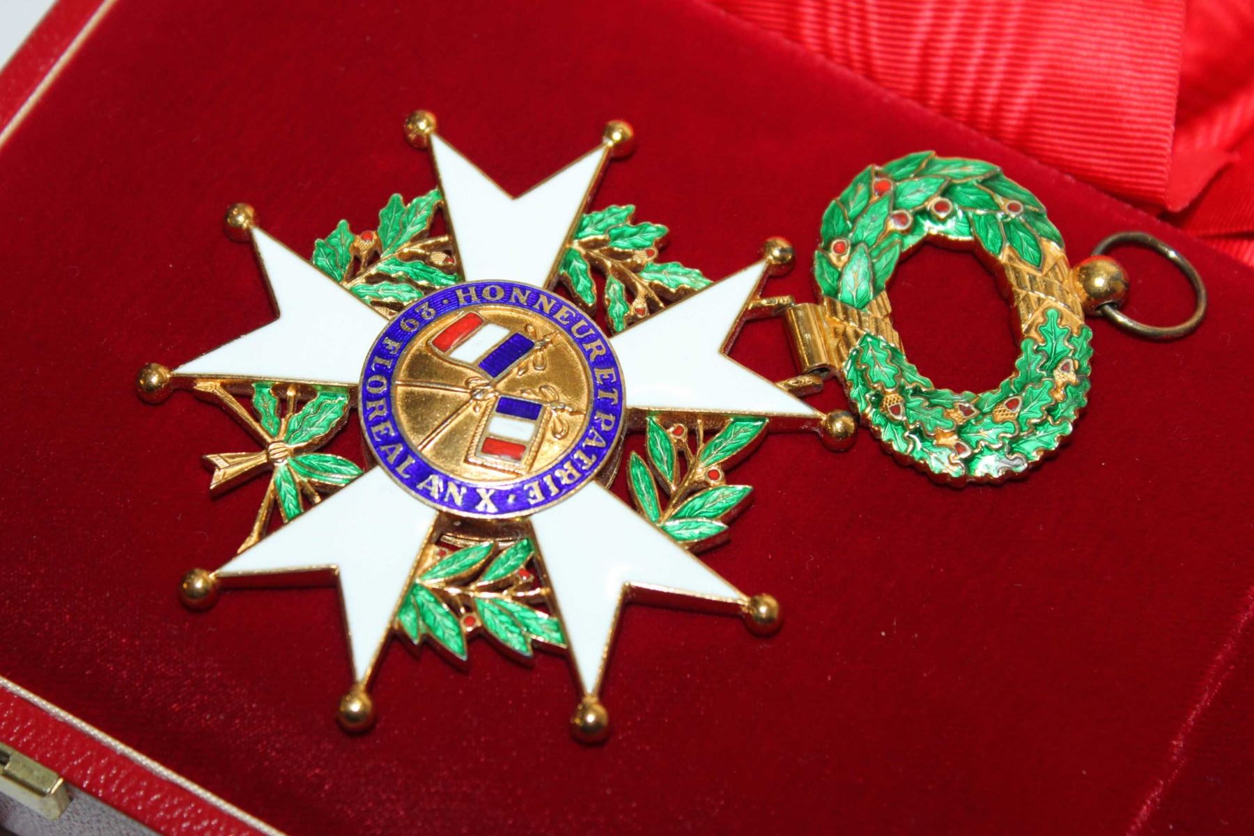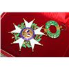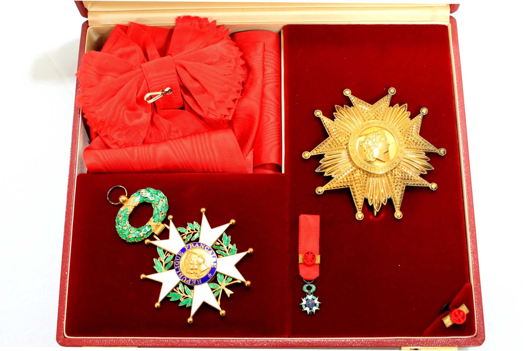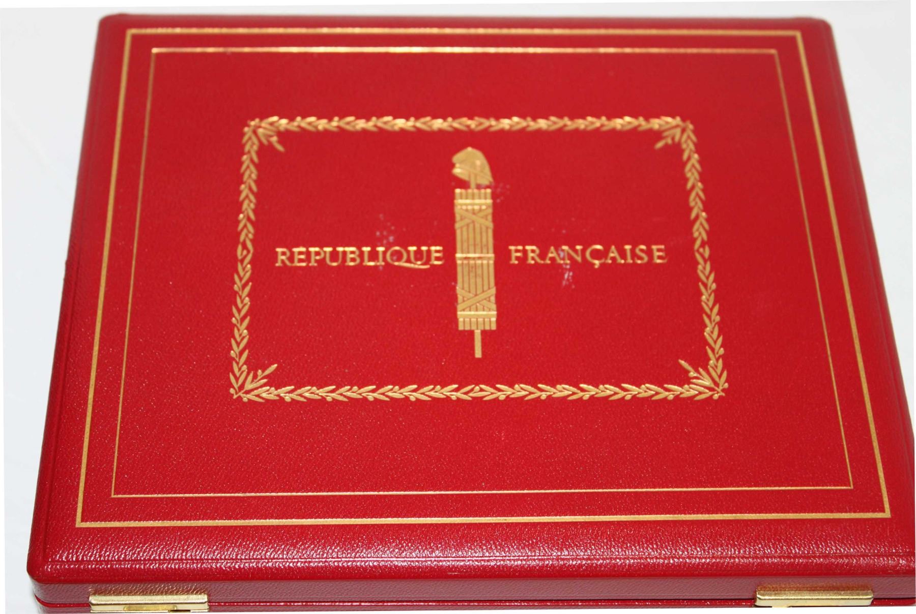 Legion of Honour medal 110 mm.106.46 gms. with sash, 100 mm.124.59 gms.gold plated silver breast badge, minature medal with commander rosette and 9 mm. rosette lapel pin. Comes in a 270 x 230 mm. red leatherette box with gold lettering and facses.Monnaie de Paris logo on interior silk.