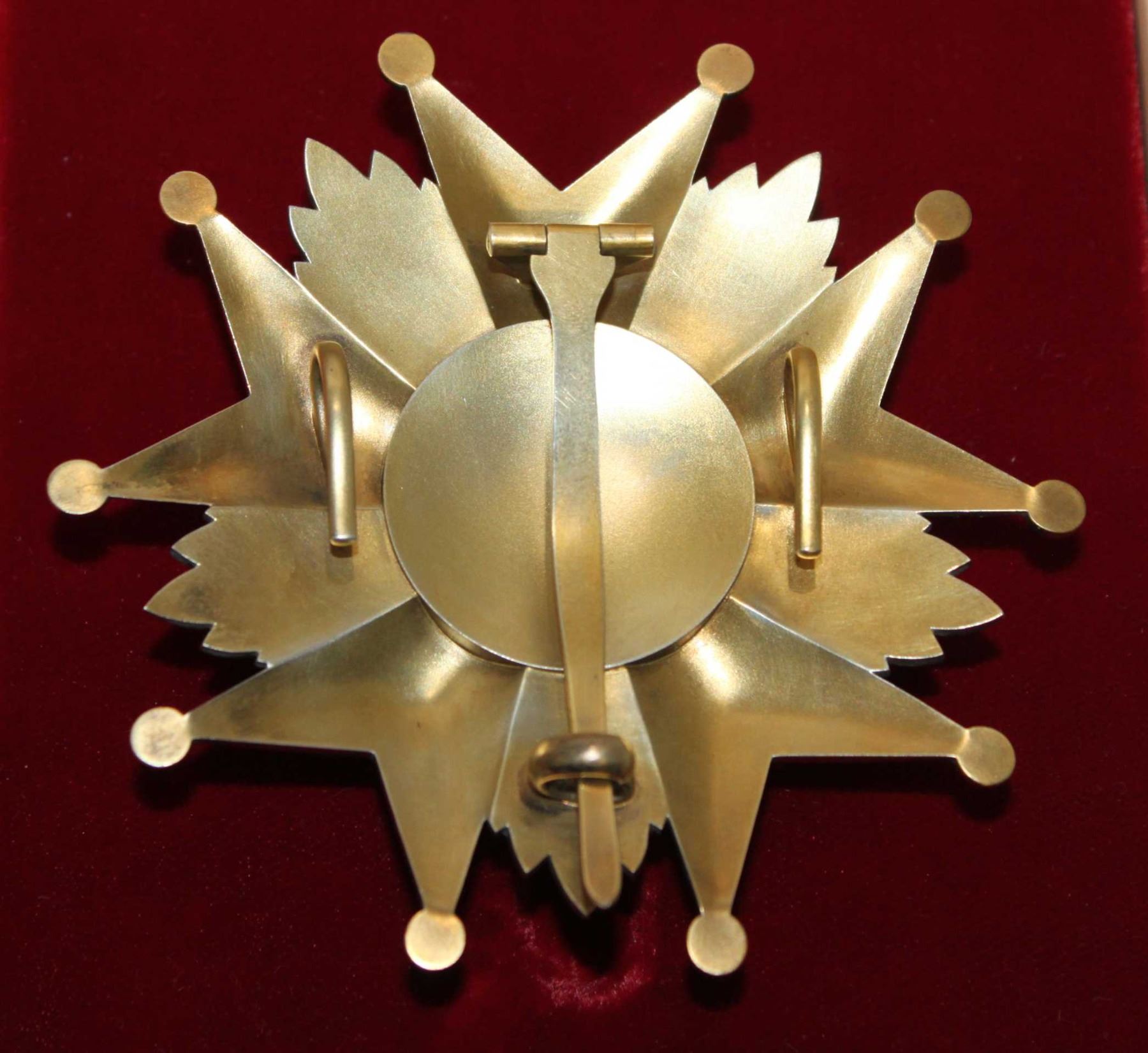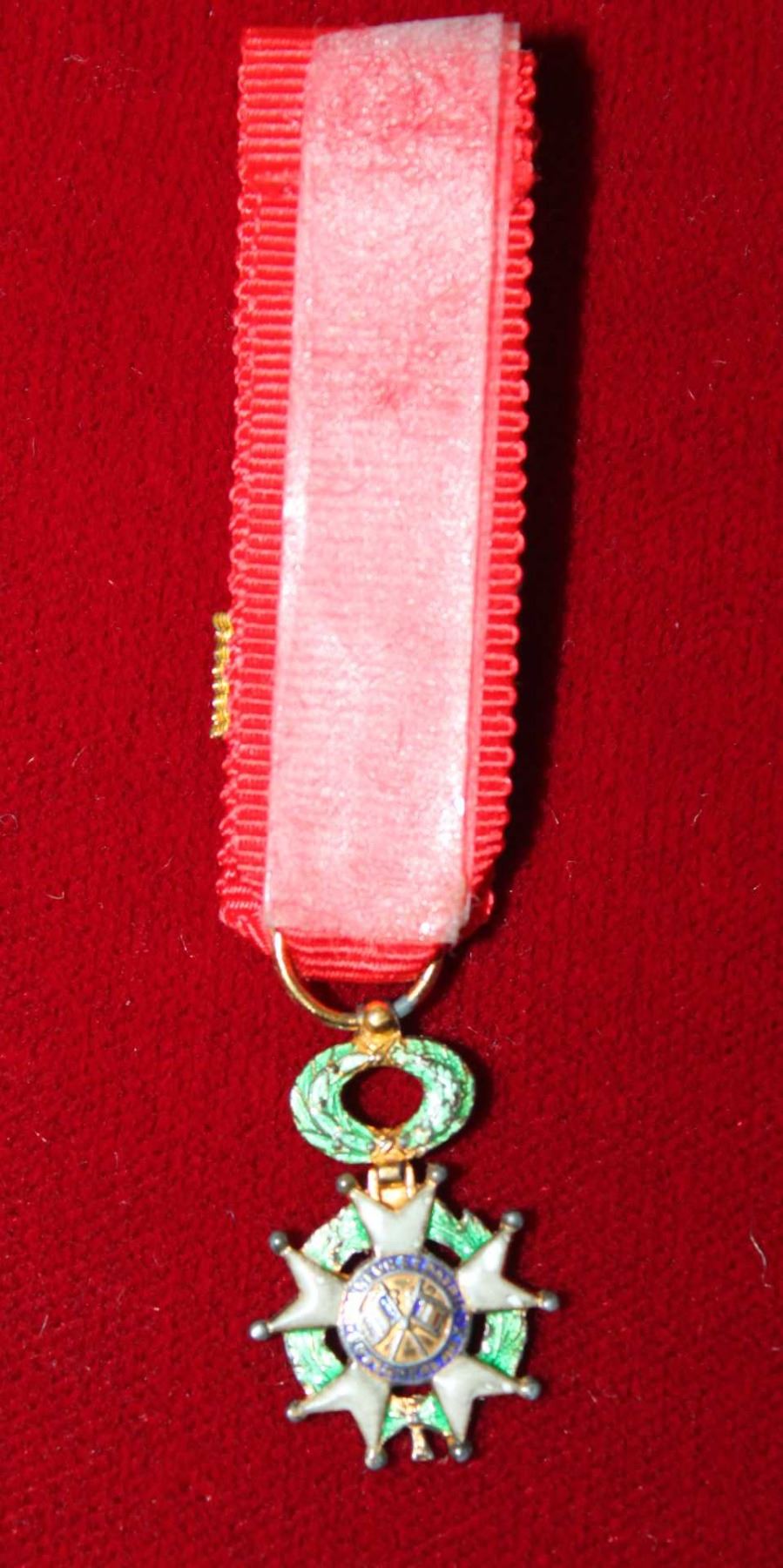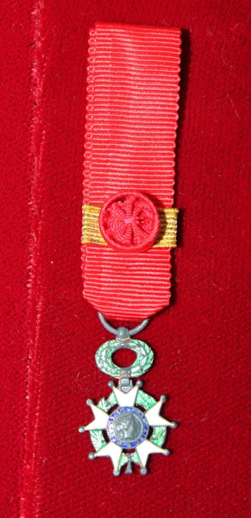 Legion of Honour medal 110 mm.106.46 gms. with sash, 100 mm.124.59 gms.gold plated silver breast badge, minature medal with commander rosette and 9 mm. rosette lapel pin. Comes in a 270 x 230 mm. red leatherette box with gold lettering and facses.Monnaie de Paris logo on interior silk.