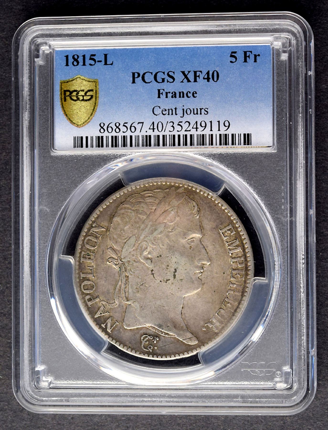 France, Five Francs, 1815-L. Struck during the "Hundred Days" of Napoleon's return to power after escaping exile. A nice sharp example of a very scarce & popular historic piece. Certified PCGS XF-40. Catalogue $1250 us.